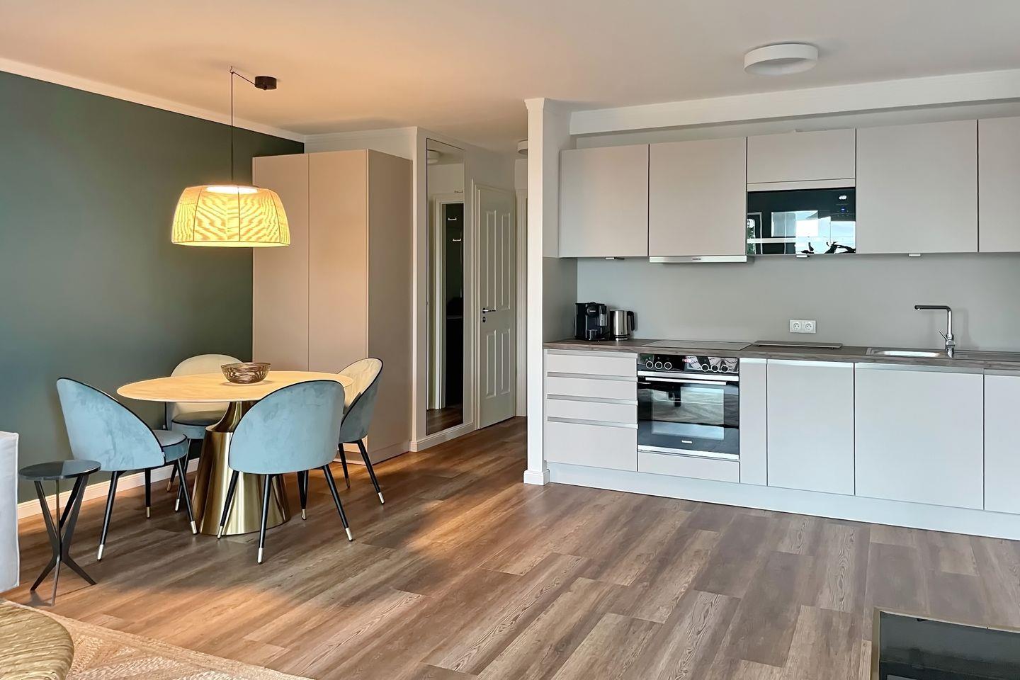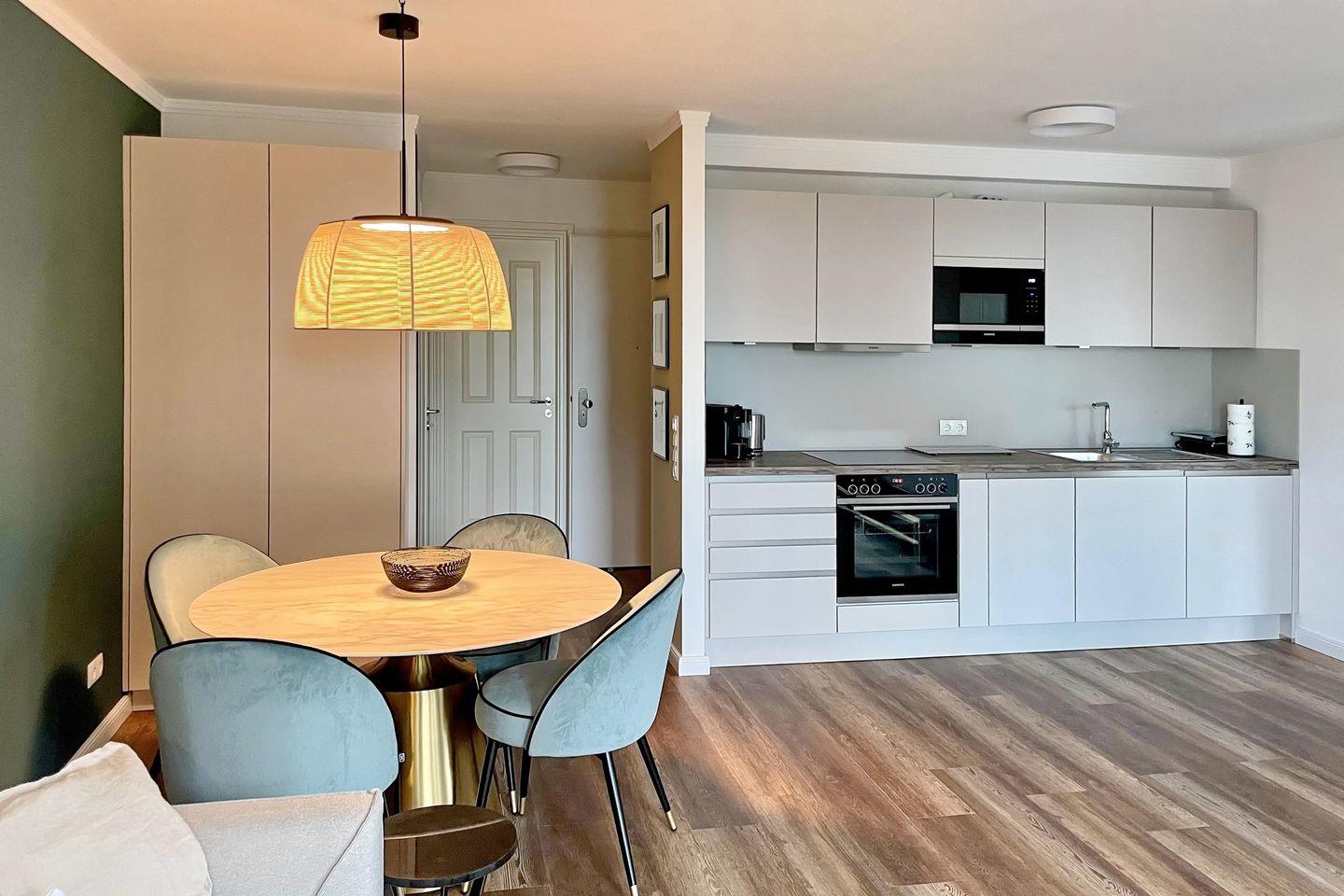 Die angrenzende offene und moderne Küchenzeile ist mit einem Kühlschrank mit Gefrierfach, einem Geschirrspüler, einem 4-Platten-Cerankochfeld, einer Mikrowelle und einem Backofen voll ausgestattet. Die Küchenausstattung wird komplettiert durch einen Toaster, eine Kaffeemaschine, eine Espressomaschine (Nespresso) und einen Wasserkocher.