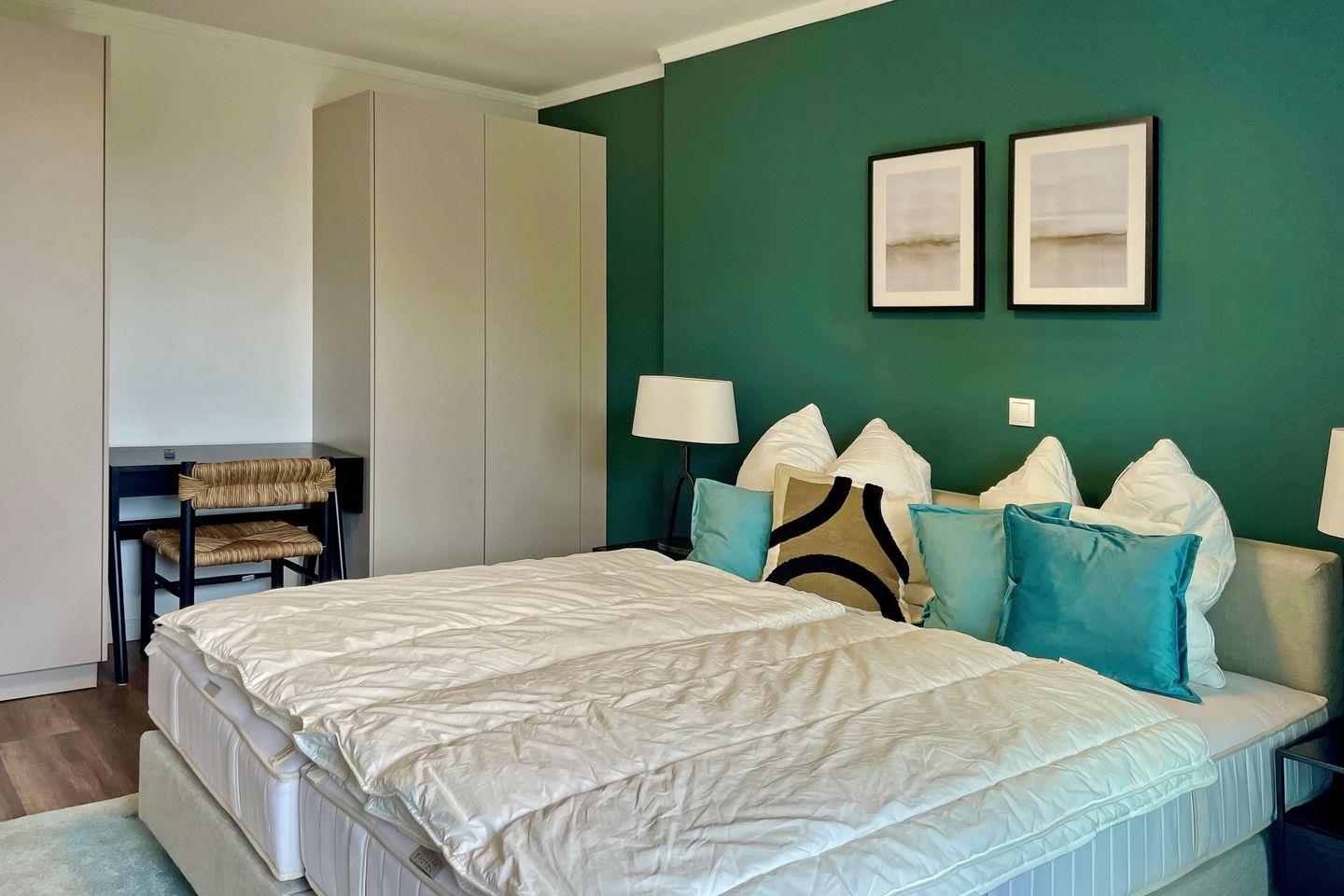 Das Schlafzimmer der Ferienwohnung ist mit einem komfortablen Boxspringbett (2 x 90 cm x 200 cm) der Marke Schramm eingerichtet. Für deine Garderobe bietet der Kleiderschrank ausreichend Stauraum. Zudem erwartet dich hier ein zweiter 43 Zoll Samsung 4K Flachbild-TV. Zur Verdunklung an den Fenstern dienen blickdichte Vorhänge.