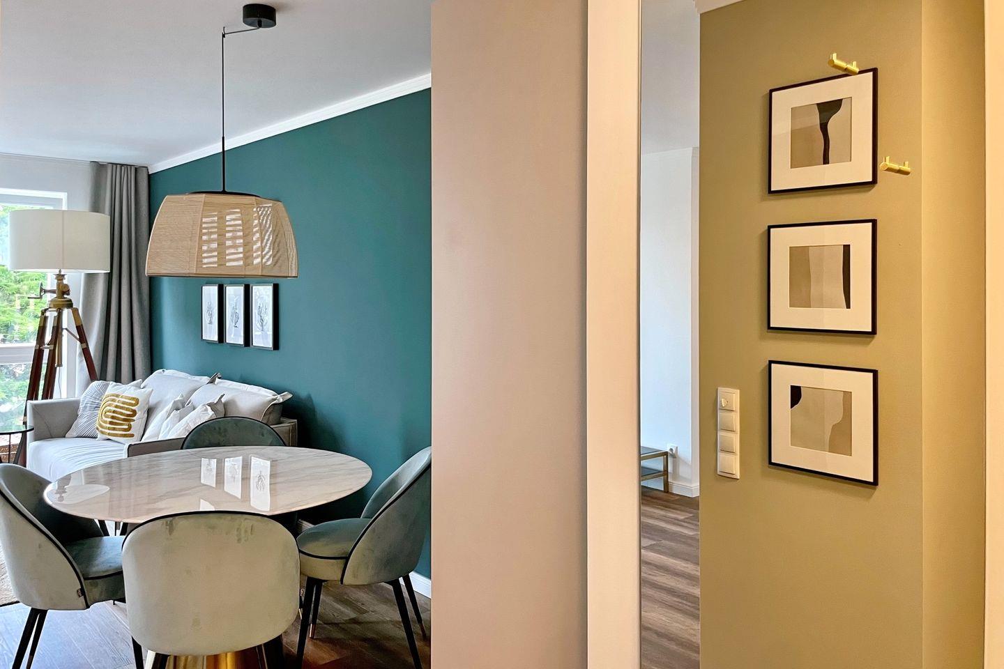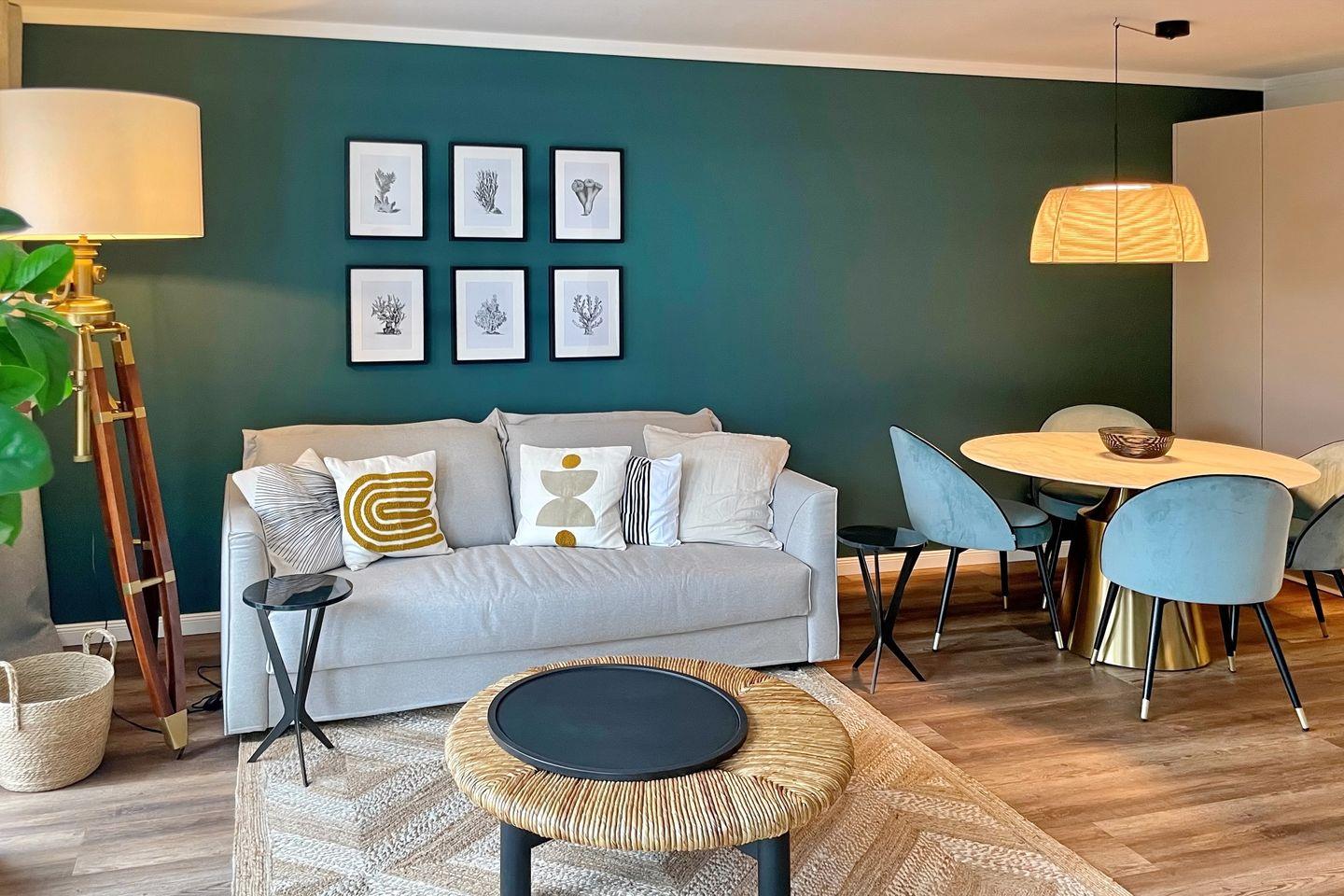 Der stilvolle Wohnbereich der Ferienwohnung lädt dich mit einer gemütlichen Schlafcouch (160x200cm) und einem 65 Zoll Samsung 4K Flachbild-TV zu geselligen Abendstunden ein. Der Essbereich ist im Wohnbereich integriert und bietet dir Platz für gemeinsame Mahlzeiten.