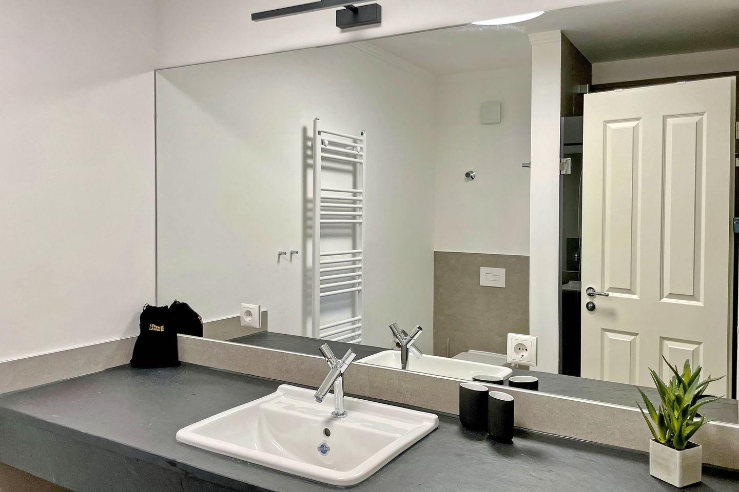 Das innenliegende Bad mit ebenerdiger Dusche ist mit einem großzügigen Waschtisch und einem Föhn ausgestattet.