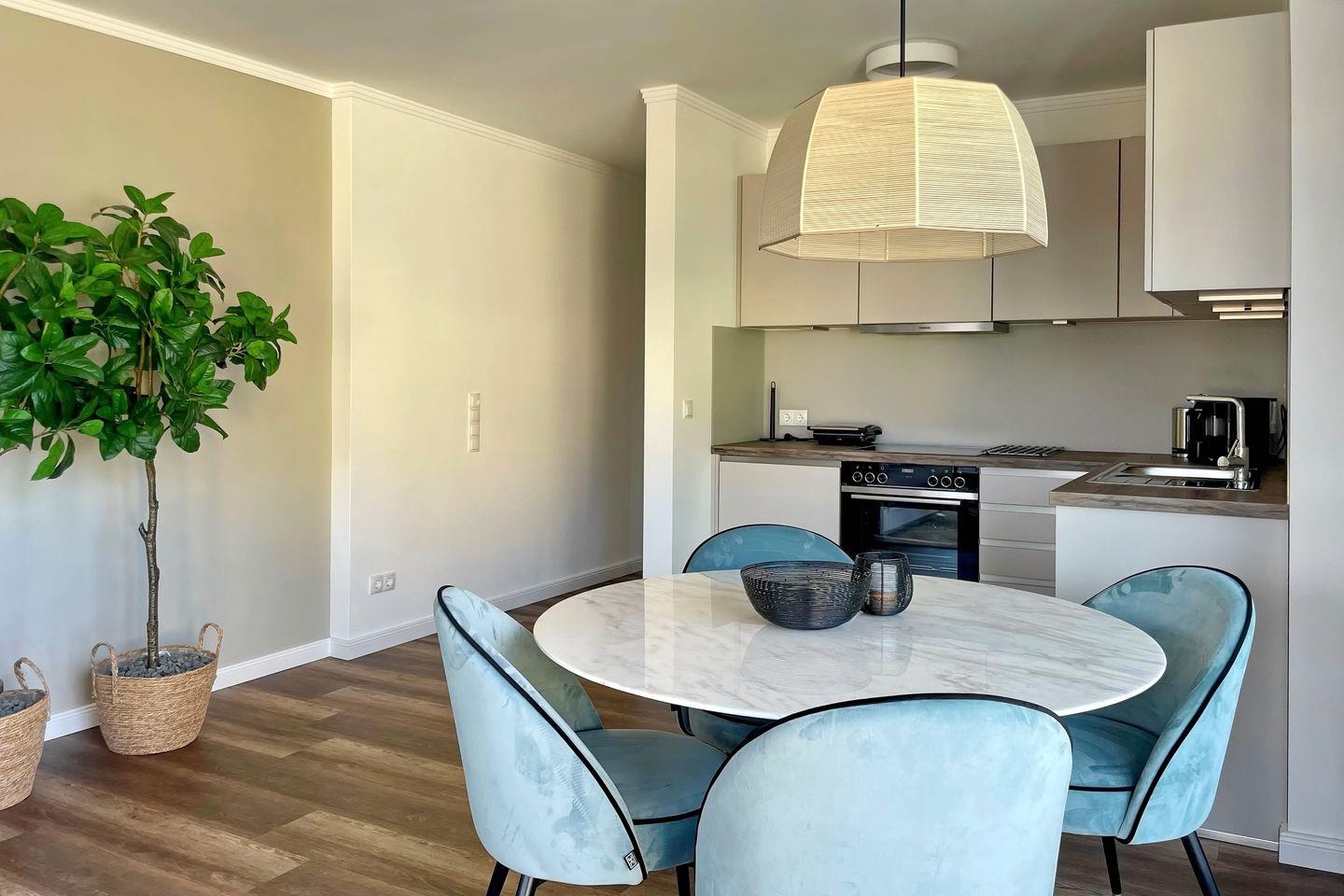 Die angrenzende offene Küchenzeile ist mit einem Kühlschrank mit Gefrierfach, einem Geschirrspüler, einem 4-Platten-Cerankochfeld, einer Mikrowelle und einem Backofen voll ausgestattet. Die Küchenausstattung wird komplettiert durch einen Toaster, eine Kaffeemaschine, eine Espressomaschine (Nespresso) und einen Wasserkocher.