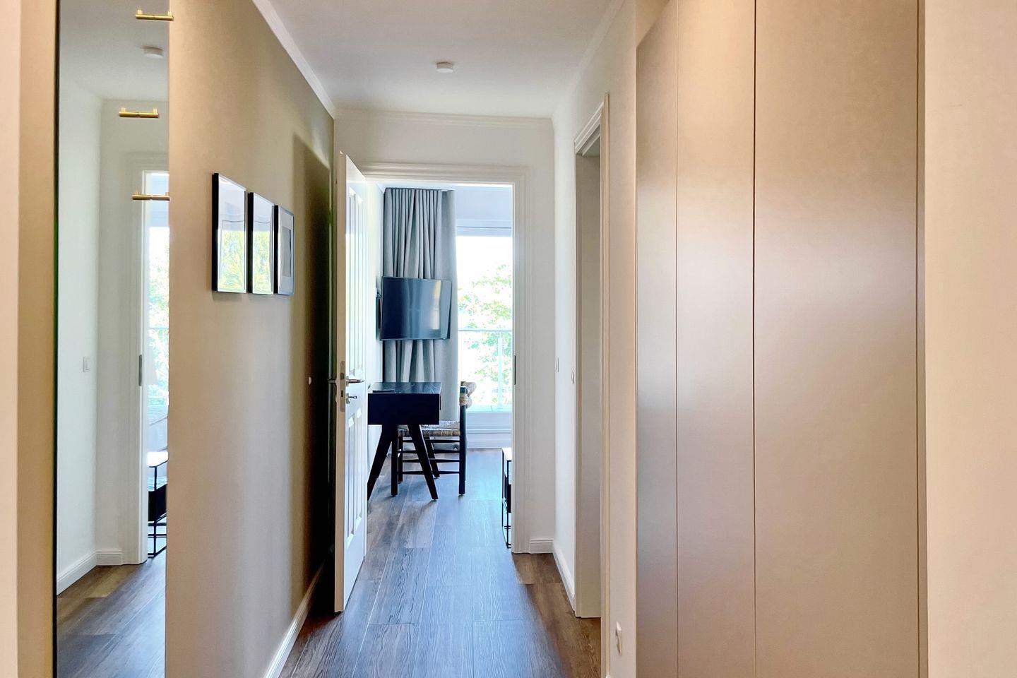 Der offene Wandschrank im Flur bietet dir ausreichend Stauraum. Das Tageslichtbad mit ebenerdiger Dusche ist mit einem großzügigen Waschtisch und einem Föhn ausgestattet.