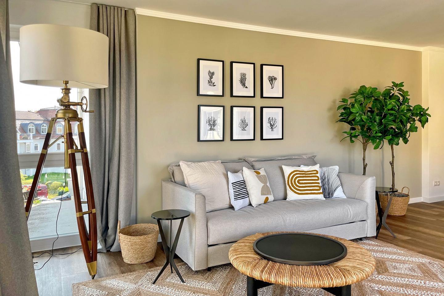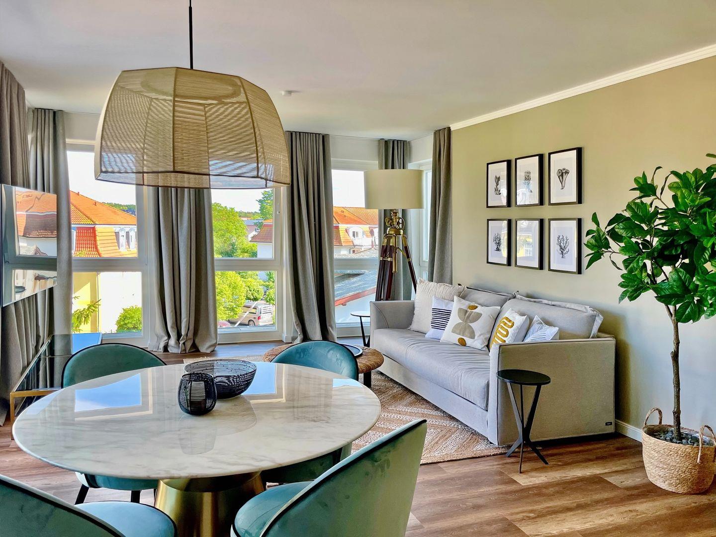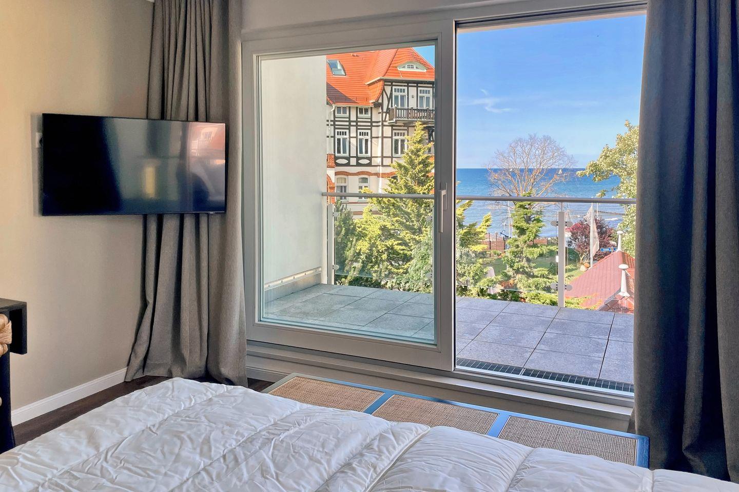 In diesem luxuriösen Penthouse mit einer Größe von ca. 76m² wird eine hochwertige und exklusive Ausstattung großgeschrieben. Das moderne 2-Zimmer-Penthouse mit Süd-Ost-Ausrichtung befindet sich in der 2.Etage der Villa Siegfried und bietet bis zu 4 Personen einen fantastischen Urlaub an der Ostsee – nach nur ca. 50 Metern bist du direkt am Strand. Die Wohnung ist in einen exklusiven Wohnbereich, einen kombinierten Ess- und Küchenbereich sowie einem gemütlichen und geschmackvollen Schlafzimmer und einem Tageslichtbad mit Dusche aufgeteilt. Auf der Dachterrasse kannst du entspannte Stunden mit einem wunderschönen Blick auf die Ostsee genießen.