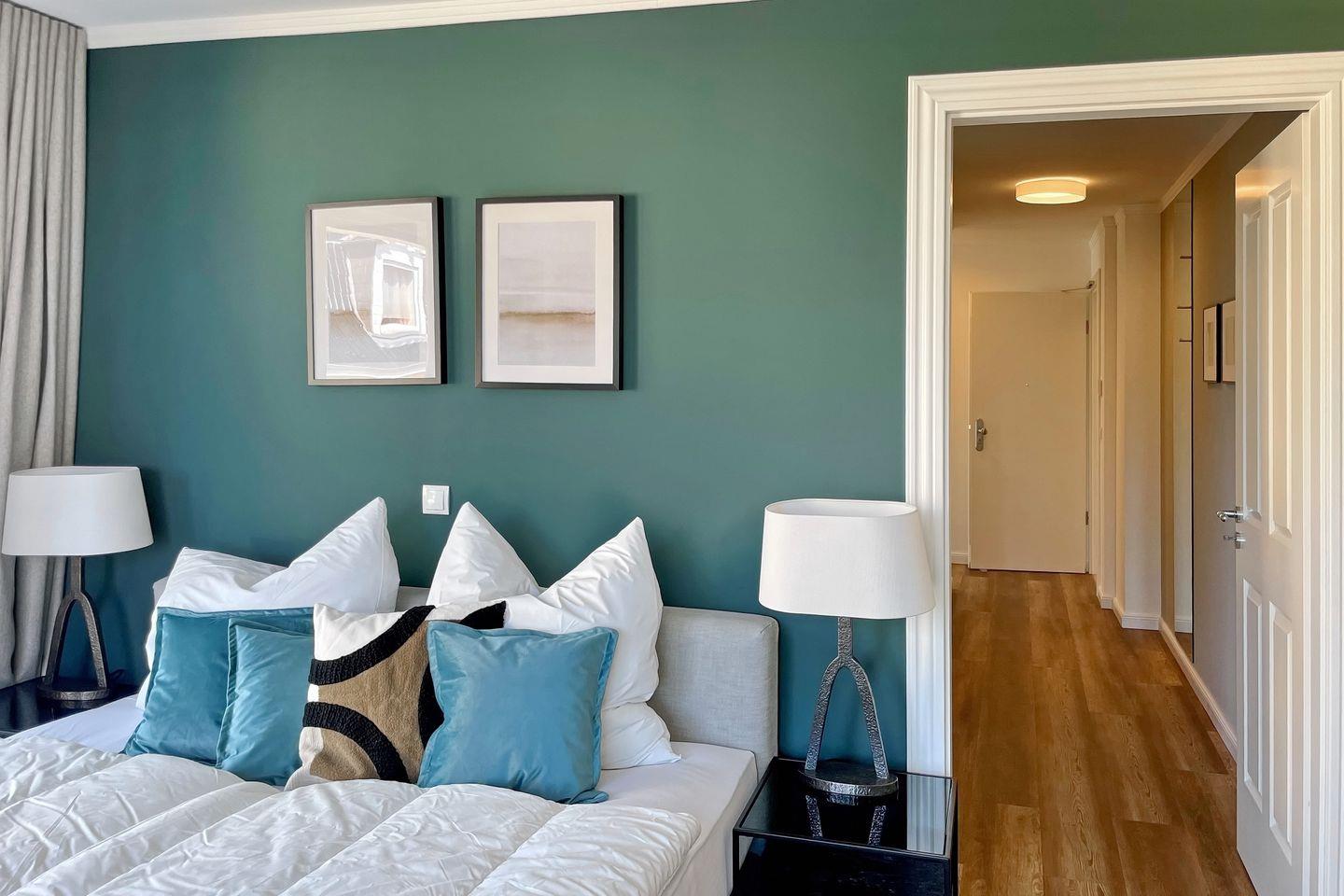Das Schlafzimmer des Penthouses ist mit einem komfortablen Boxspringbett (2 x 90 cm x 200 cm) der Marke Schramm eingerichtet. Zudem erwartet dich hier ein zweiter 43 Zoll Samsung 4K Flachbild-TV. Zur Verdunklung an den Fenstern dienen blickdichte Vorhänge.