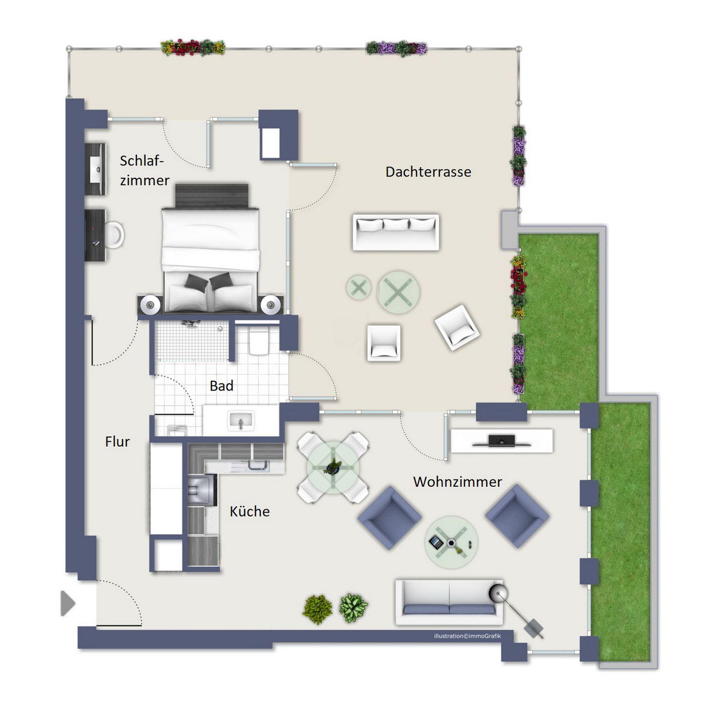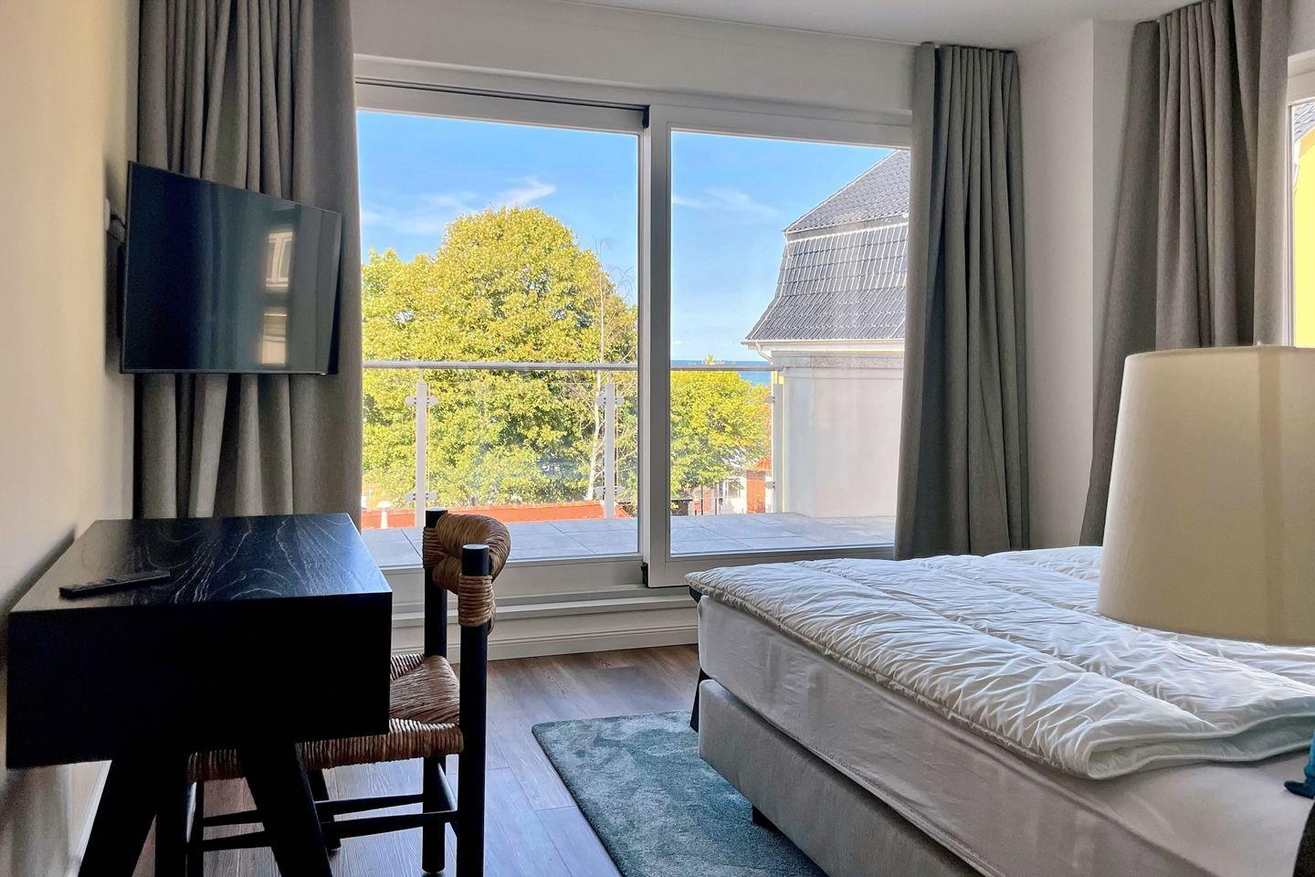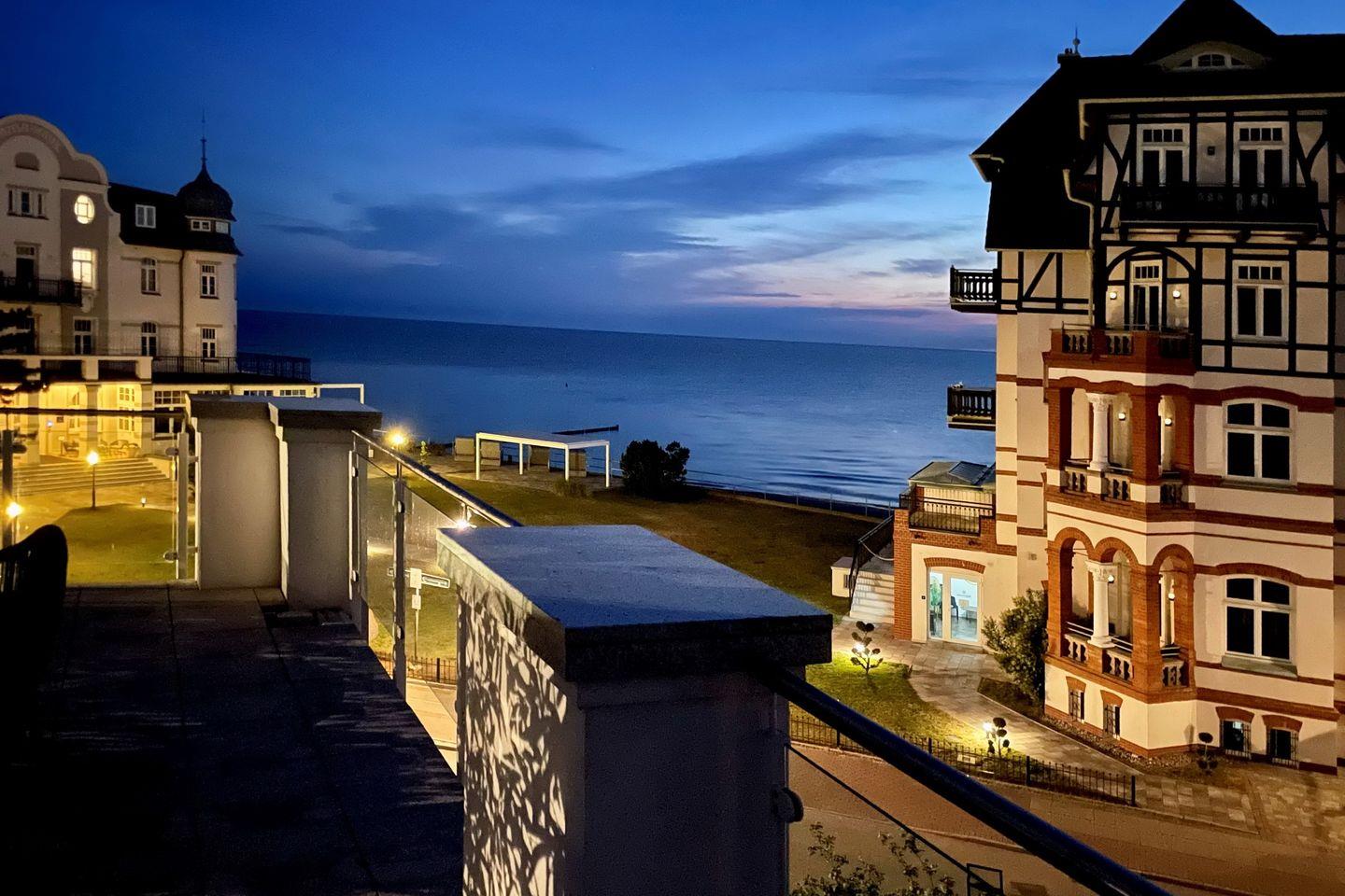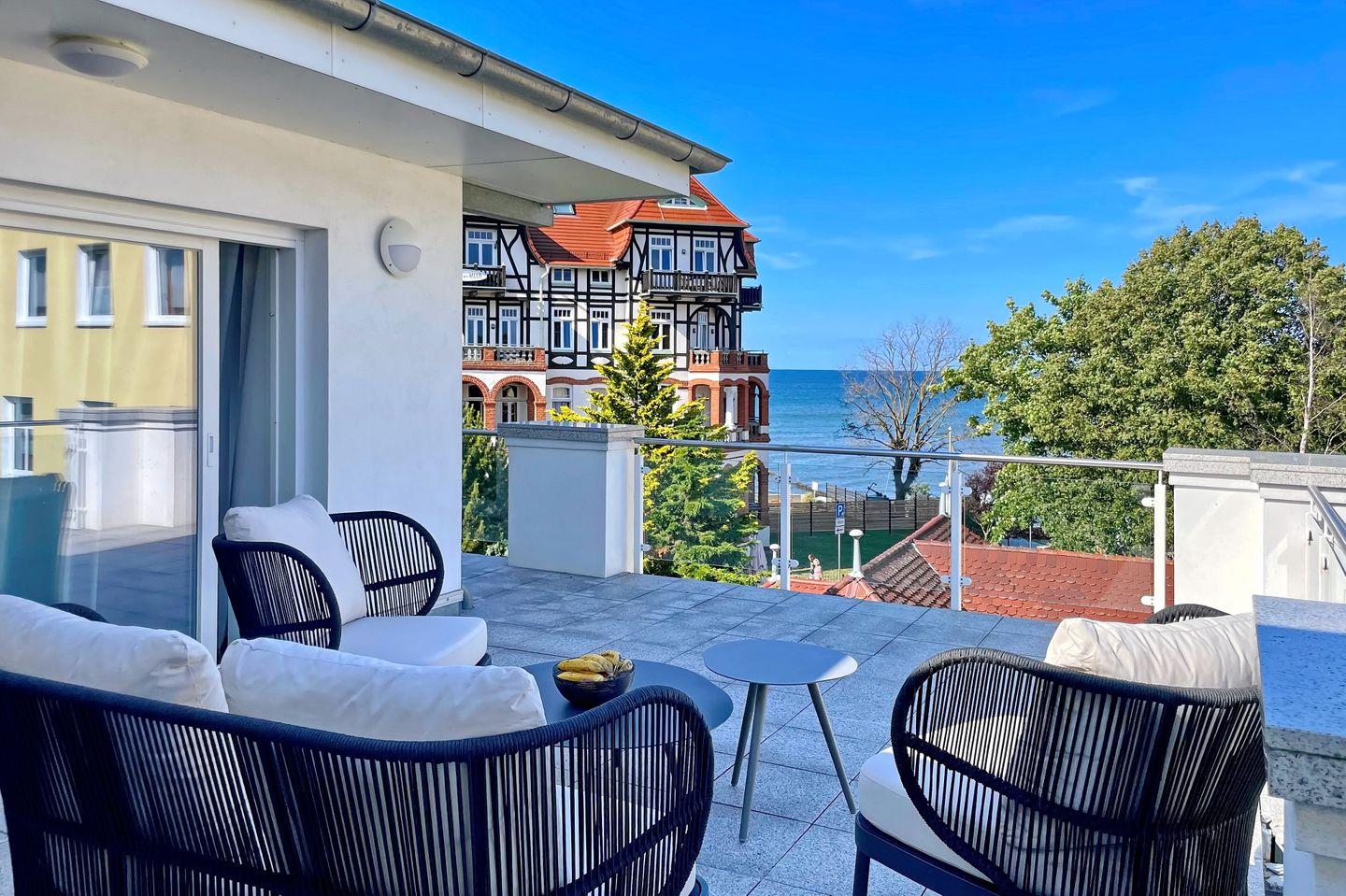 Die großzügige Süd-Ost Dachterrasse verläuft vom Wohnzimmer bis zum Schlafzimmer. Die Dachterrasse ist mit geschmackvollen Loungemöbel ausgestattet und lädt für entspannte Abende mit direktem Meerblick ein. Genieße in den Abendstunden einen wundervollen Sonnenuntergang.