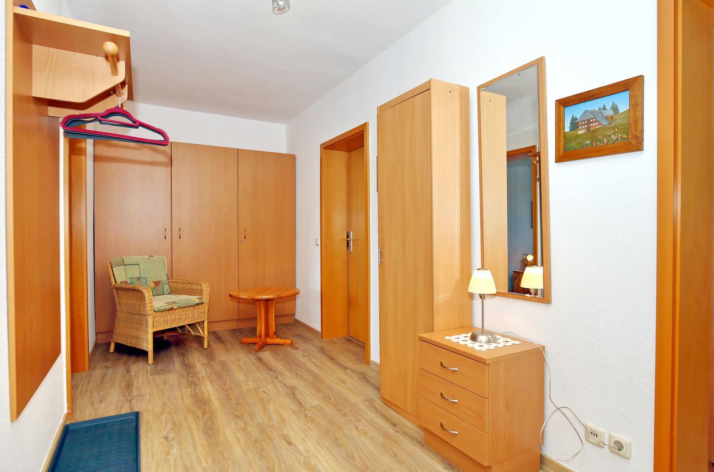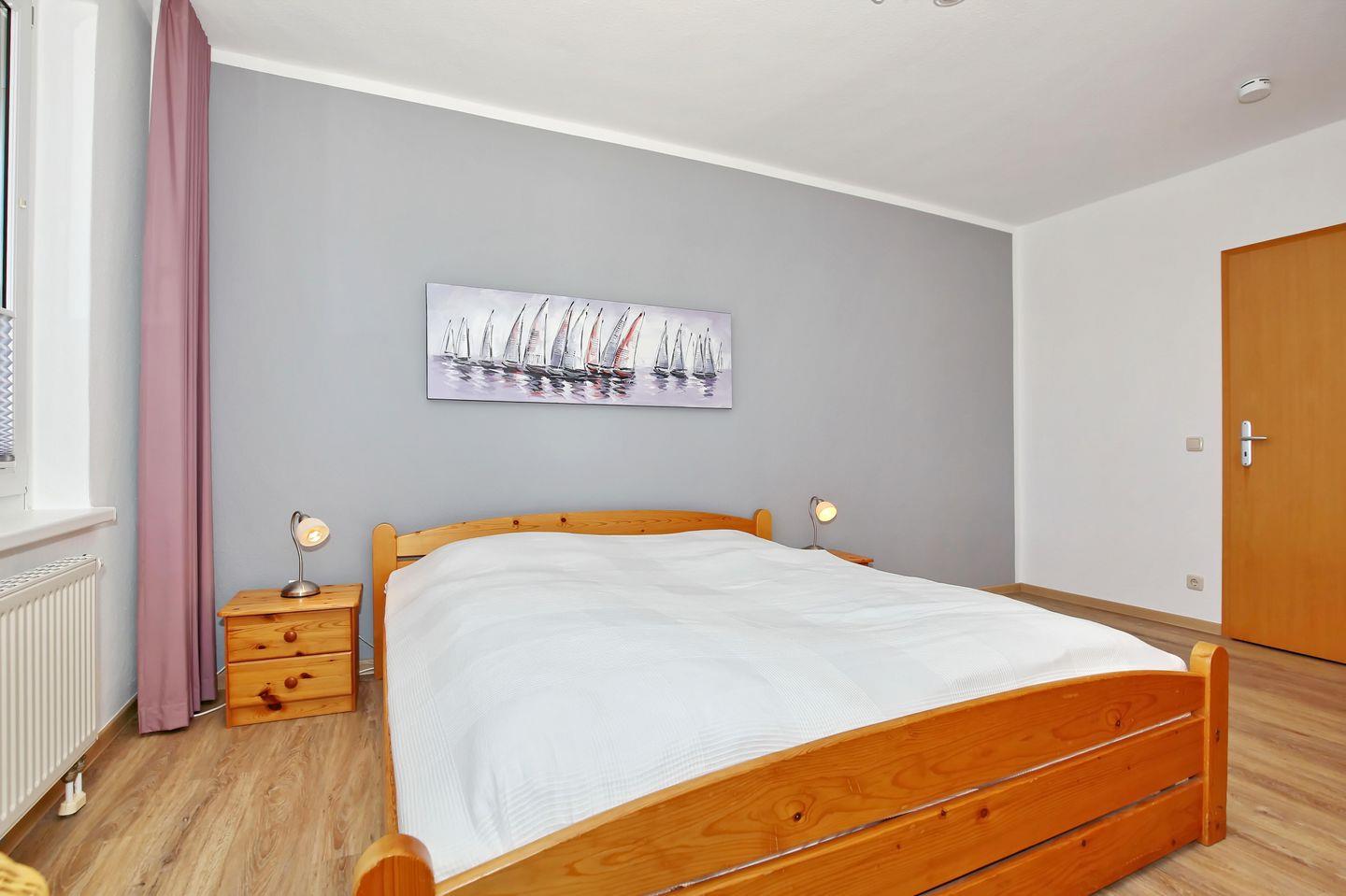 Im Schlafzimmer lädt dich ein komfortables Doppelbett zur erholsamen Nachtruhe ein. Für deine Urlaubsgarderobe steht ein großer Kleiderschrank, eine Kommode und zwei Nachtschränke bereit. Ein Rollo dient dir als Sichtschutz oder zur Verdunkelung.