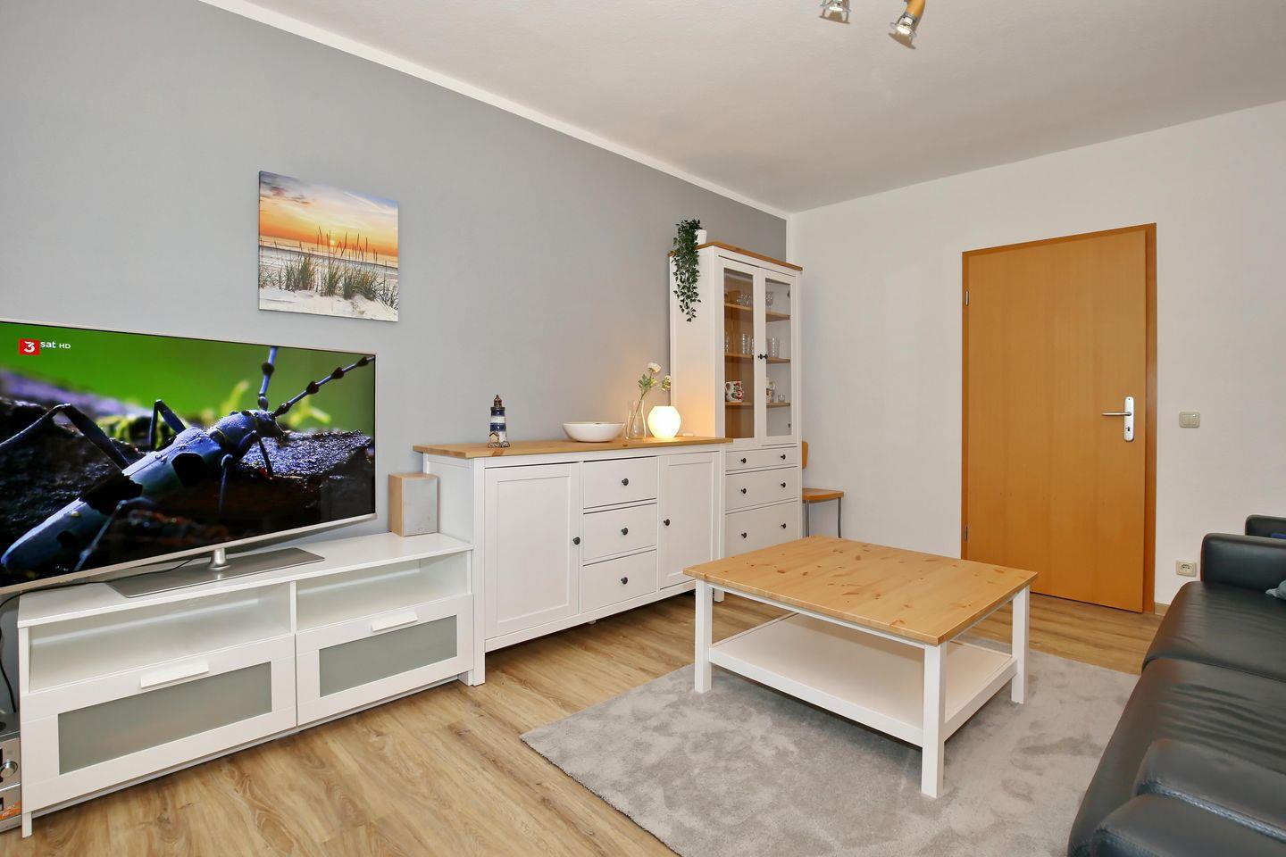 Der großzügige Wohnbereich der Ferienwohnung ist mit einer Schlafcouch, zwei Sesseln, einer Anbauwand und einem Flachbild-TV eingerichtet. Vom Wohnzimmer aus hast du Zugang zum möblierten Balkon. Hier lassen sich entspannte Nachmittage verbringen.