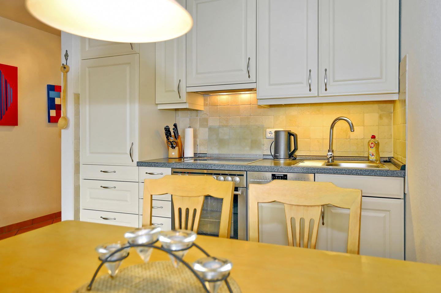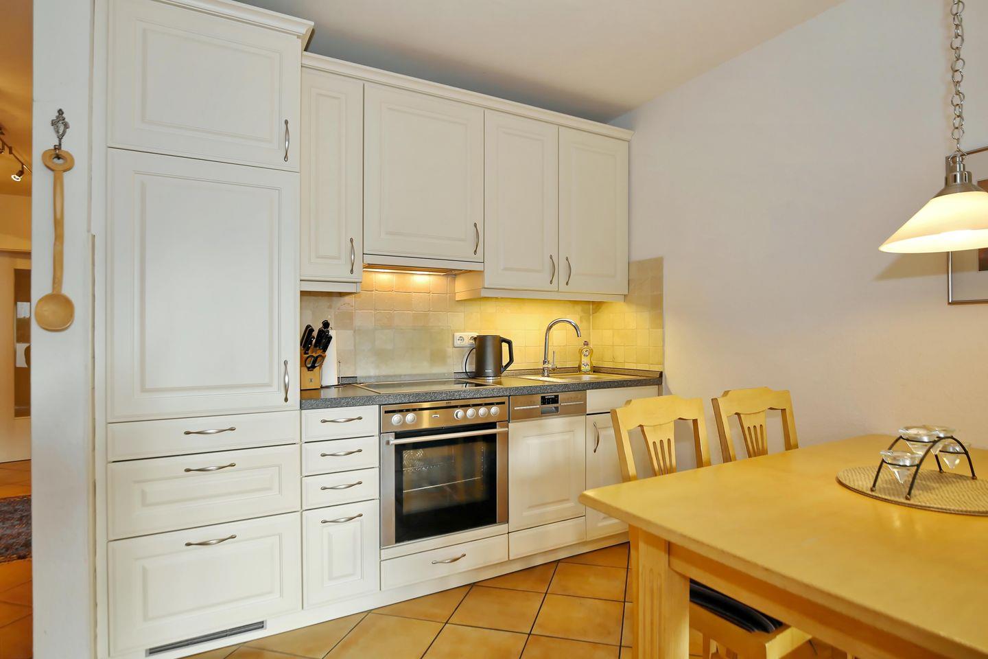 Die integrierte Küchenzeile ist ausgestattet mit einem Kühlschrank mit Gefrierfach, einem Geschirrspüler, einem 4-Platten-Cerankochfeld und einem Backofen. Ebenso stehen dir ein Wasserkocher, ein Toaster und eine Kaffeemaschine zur Verfügung.