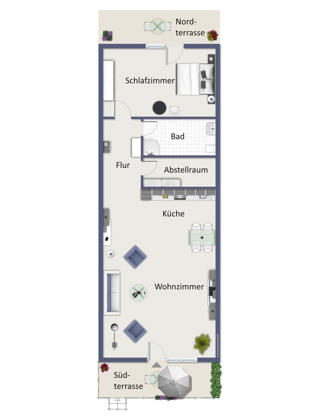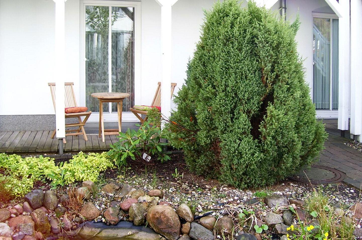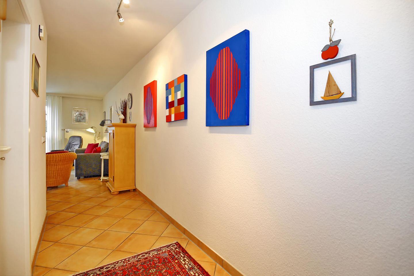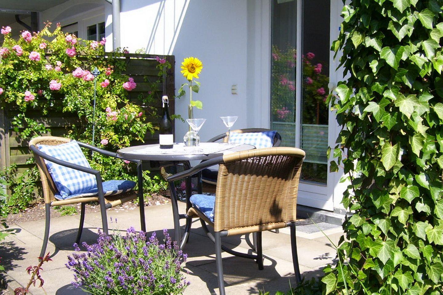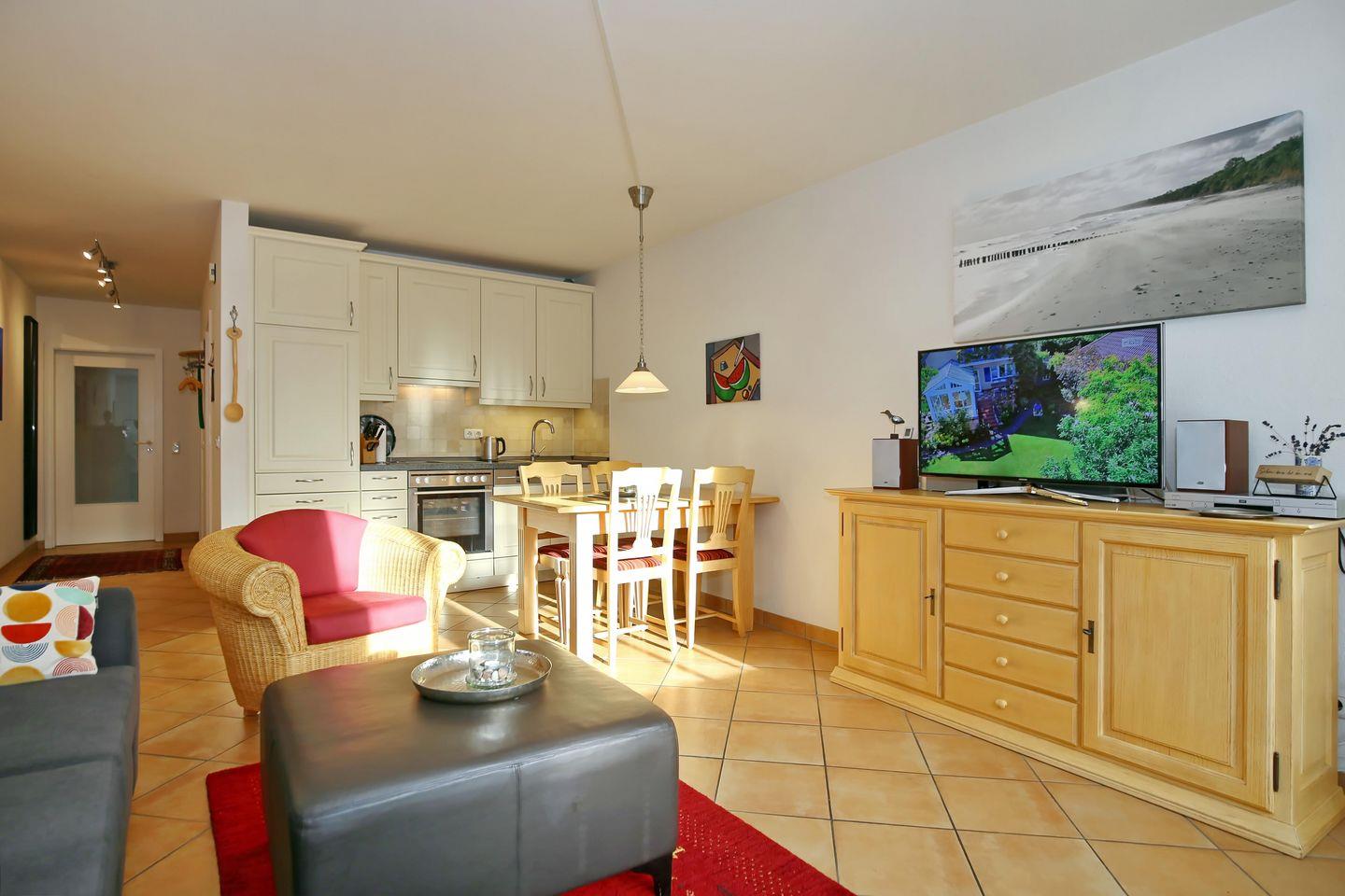 Die Wohnung Nr. 08 befindet sich im Erdgeschoss des Hauses. Auf etwa 55 m² verteilen sich ein Schlafzimmer, ein Wohnbereich mit integrierter Küchenzeile, ein Duschbad, zwei Terrassen und ein Abstellraum. Die Entfernung von der Ferienwohnung bis zum Strand beträgt etwa 900 Meter.