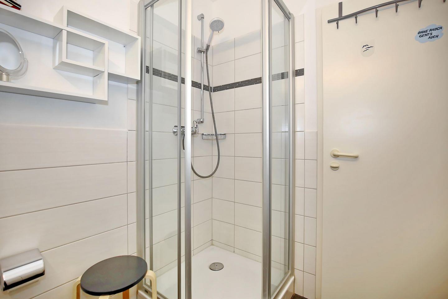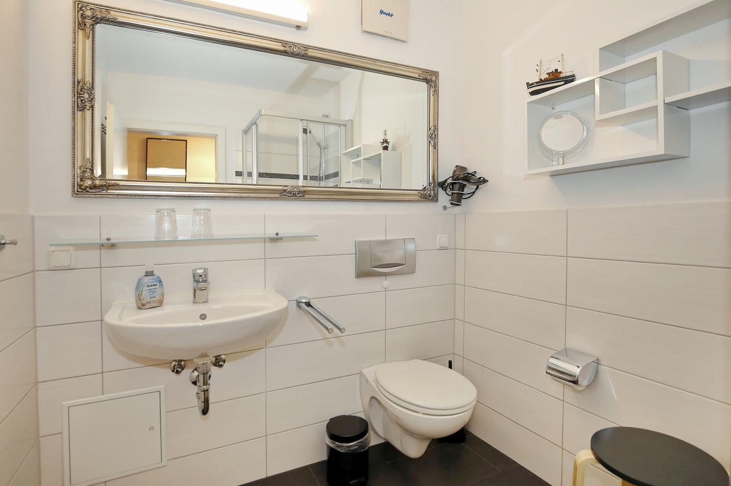 Das geflieste Badezimmer verfügt über einen Waschtisch, eine Dusche, einen Haartrockner, einen Kosmetikspiegel und ein WC. In der gesamten Ferienwohnung wurden Fliesen verlegt.