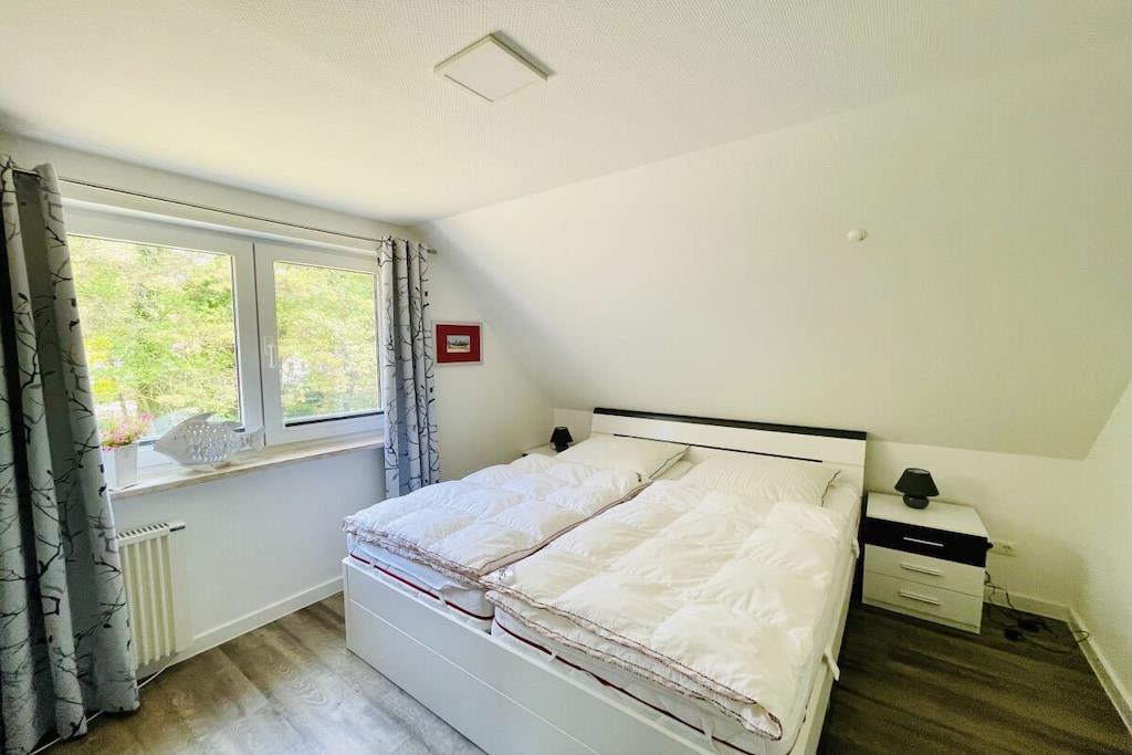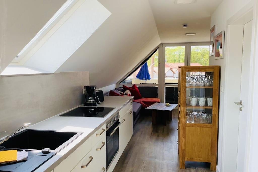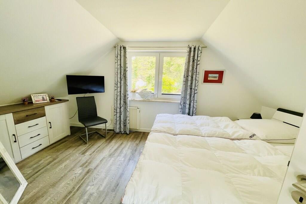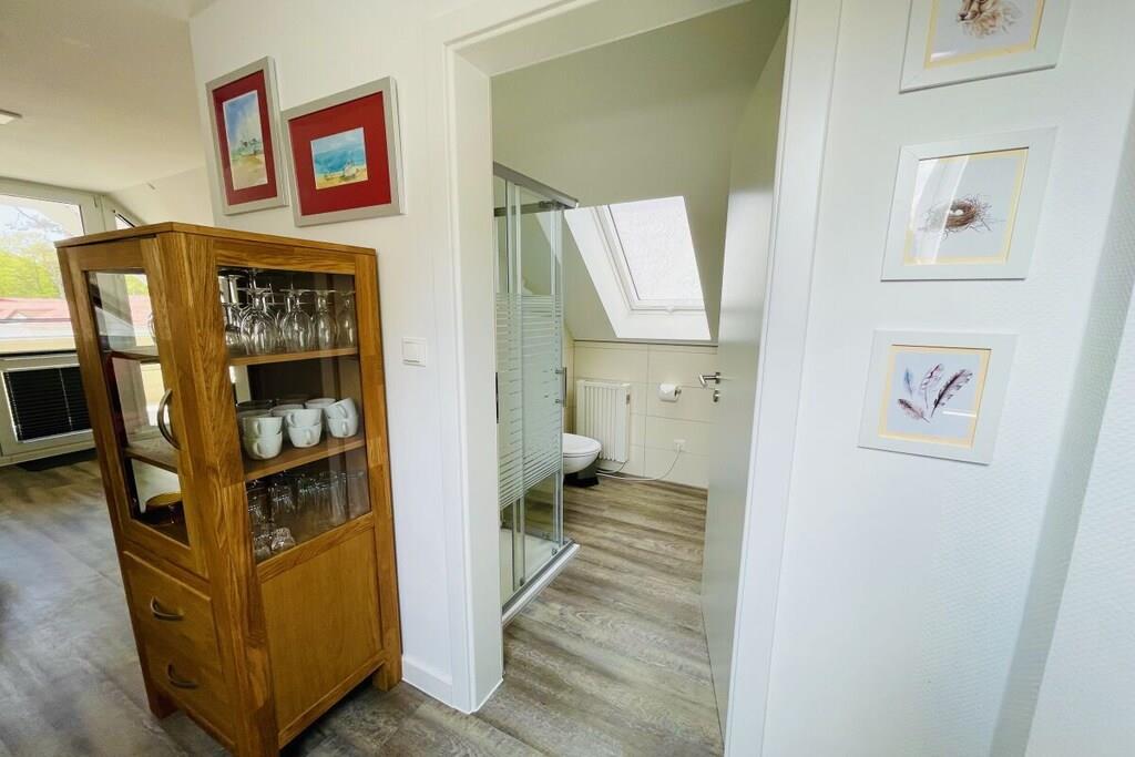 Unser freundliches Apartment befindet sich im Obergeschoss, ist circa 48m² groß und verfügt über einen Wohn-und Essbereich, welcher mit Couch, kleinem Esstisch , Smart-TV ausgestattet ist. Die offene Küche verfügt unter anderem über einen Geschirrspüler, Backofen mit 4-Platten-Cerankochfeld, Kühlschrank, Toaster, Kaffeemaschine & Wasserkocher. Von hier aus gelangen Sie ins Schlafzimmer, welches über ein gemütliches Doppelbett und einen Kleiderschrank verfügt. Das kleinen Badezimmer mit Dusche und WC lässt keine Wünsche offen. Dieses sympathische Apartment eignet sich hervorragend für Paare, die Ihre Urlaubszeit gerne aktiv gestalten und unsere Region erkunden möchten. Es handelt sich um eine Nichtraucherunterkunft in der Hunde auf Anfrage gestattet sind.
