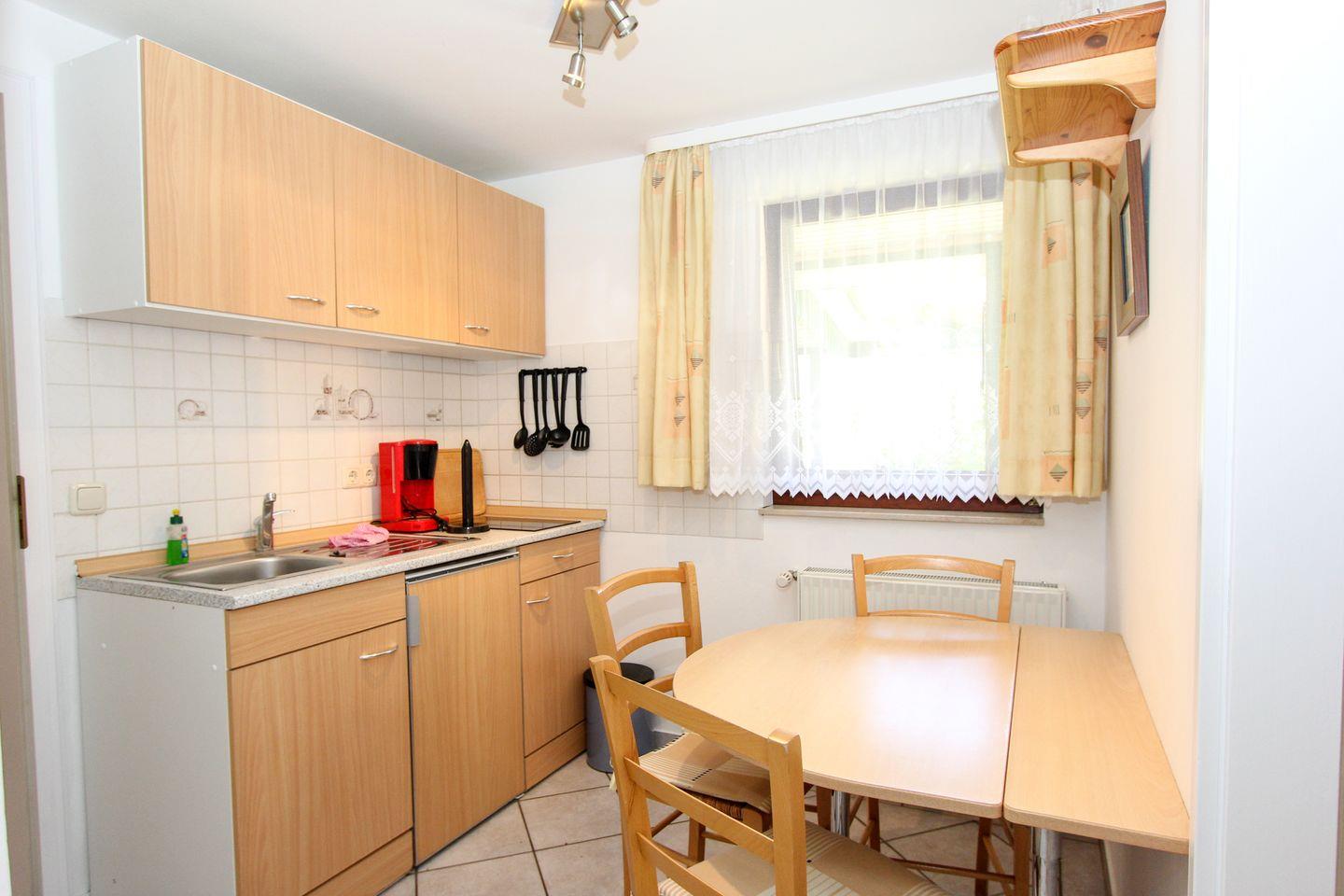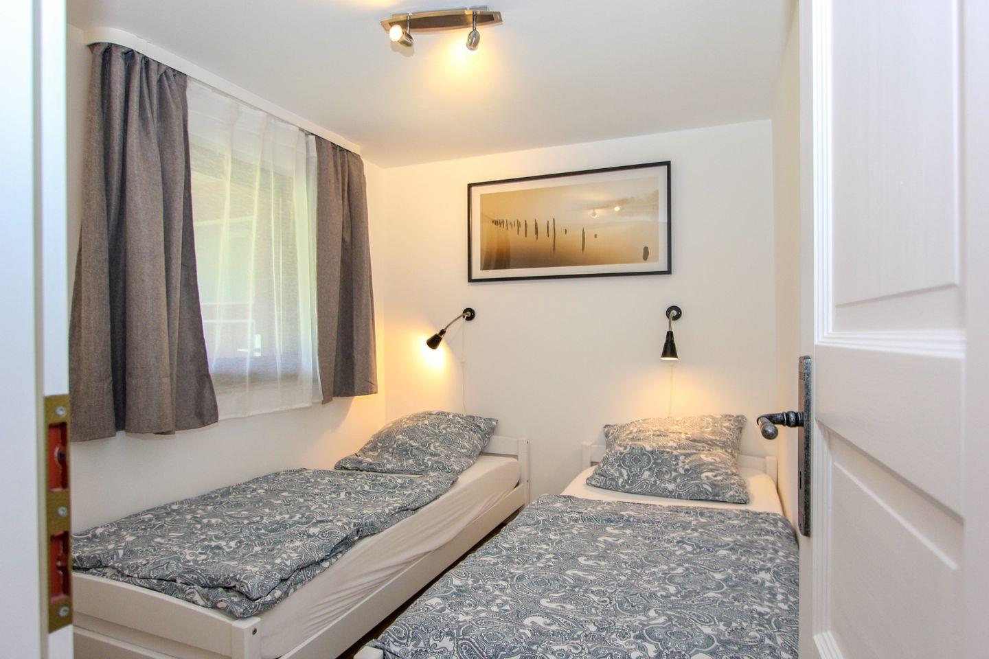 Die Ferienwohnung verfügt über ein Schlafzimmer mit zwei Einzelbetten, ein modernes Wohnzimmer und eine offene Küche. Hier finden Sie alles, was Sie benötigen: einen Herd mit Ceranfeld, Kühlschrank, Kaffeemaschine, Wasserkocher und Toaster.