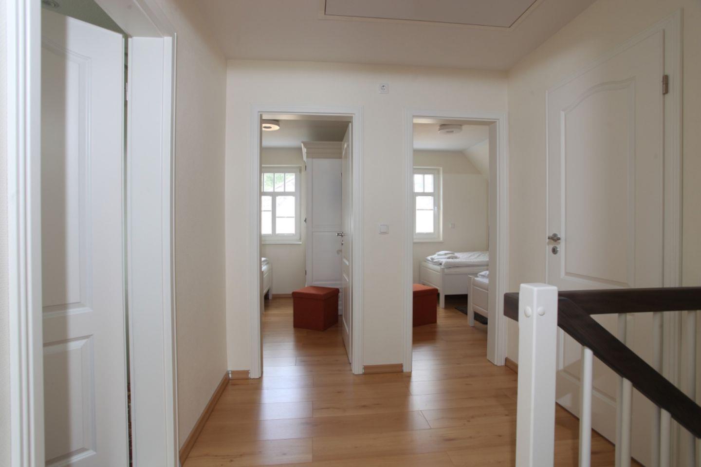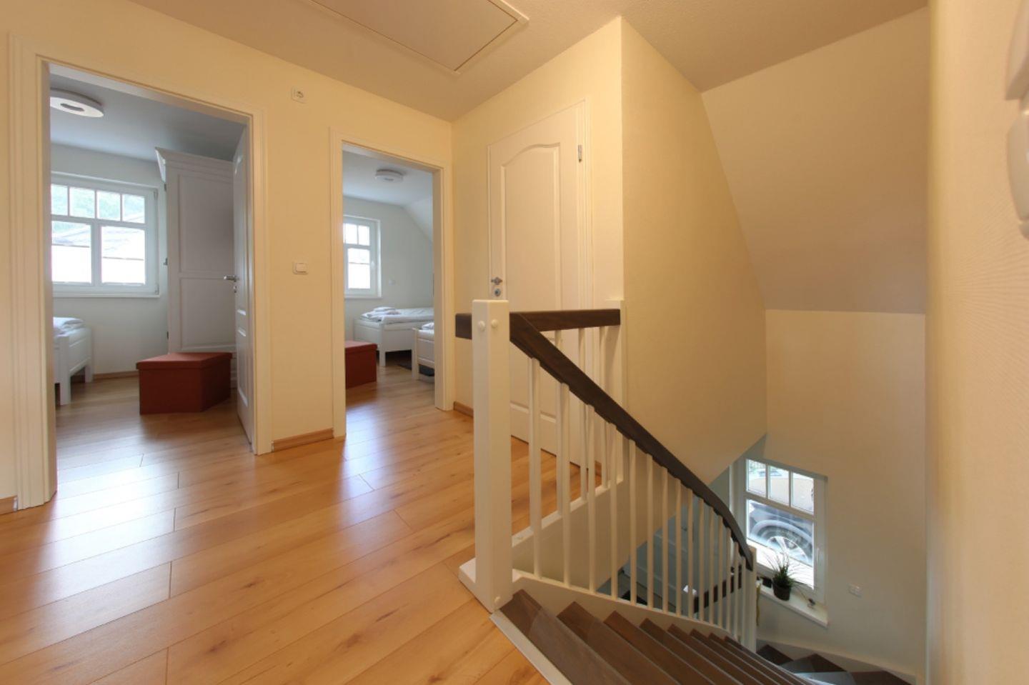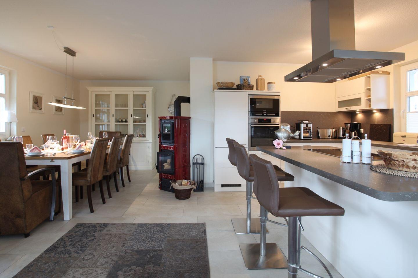 Der Lebensmittelpunkt des Hauses ist der großzügige Wohn- und Essbereich im Erdgeschoss mit Kamin. Die hochwertig ausgestattete und zum Wohnzimmer hin offene Küche lässt keine Wünsche offen. Ein großer Esstisch und eine gemütliche Couch komplettieren den Wohnkomfort. Das Haus verfügt im Erdgeschoss über 1 Schlafzimmer und 1 Badezimmer mit Dusche und angrenzender Sauna. Im Obergeschoss befinden sich die 3 Schlafzimmer. Ein Schlafzimmer verfügt über ein Boxspringbett und die anderen beiden Schlafzimmer sind mit je zwei Einzelbetten ausgestattet. Eins der Schlafzimmer verfügt über ein separates Bad. Im Obergeschoss steht Ihnen ein weiteres Gemeinschaftsbadezimmer zur Verfügung.