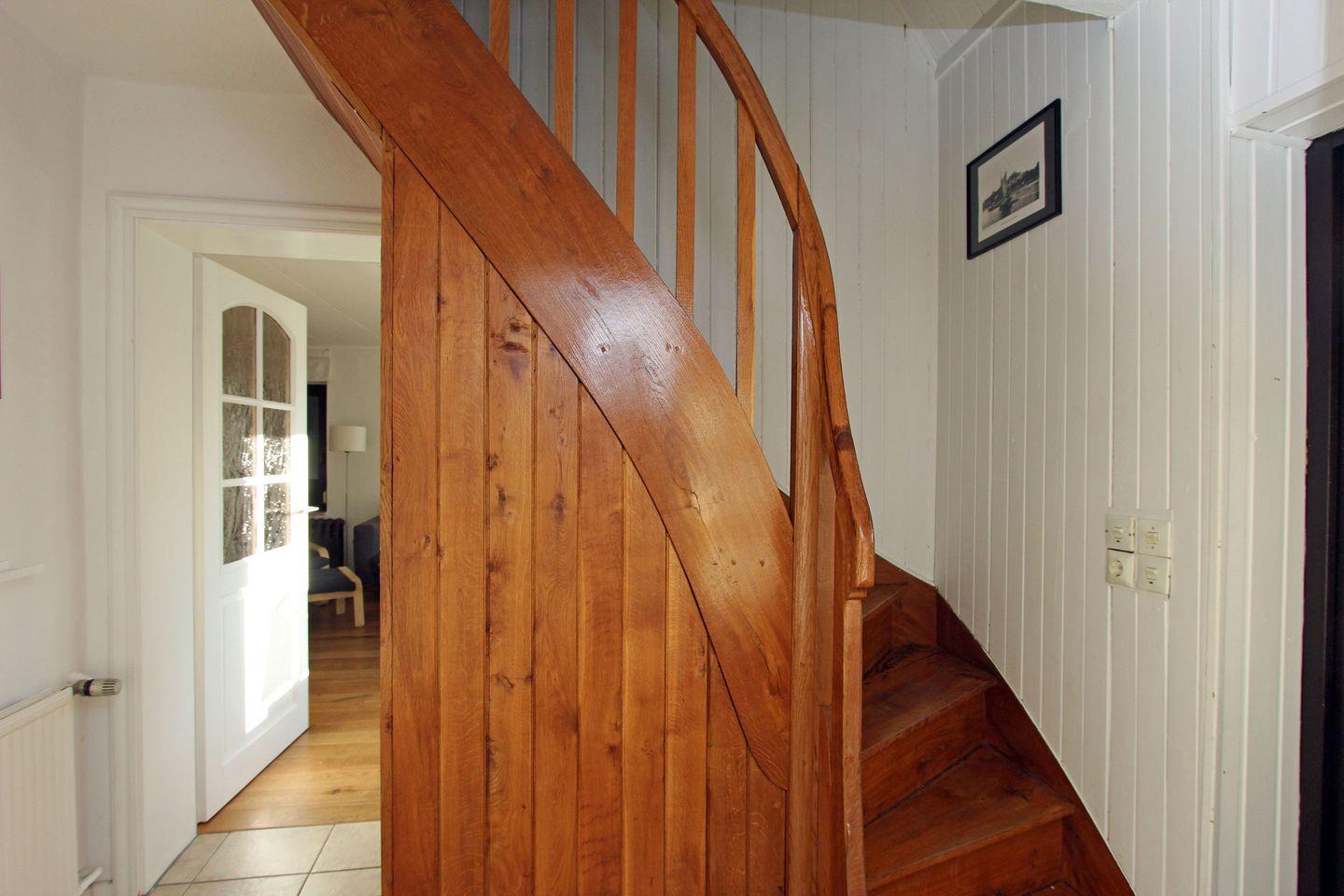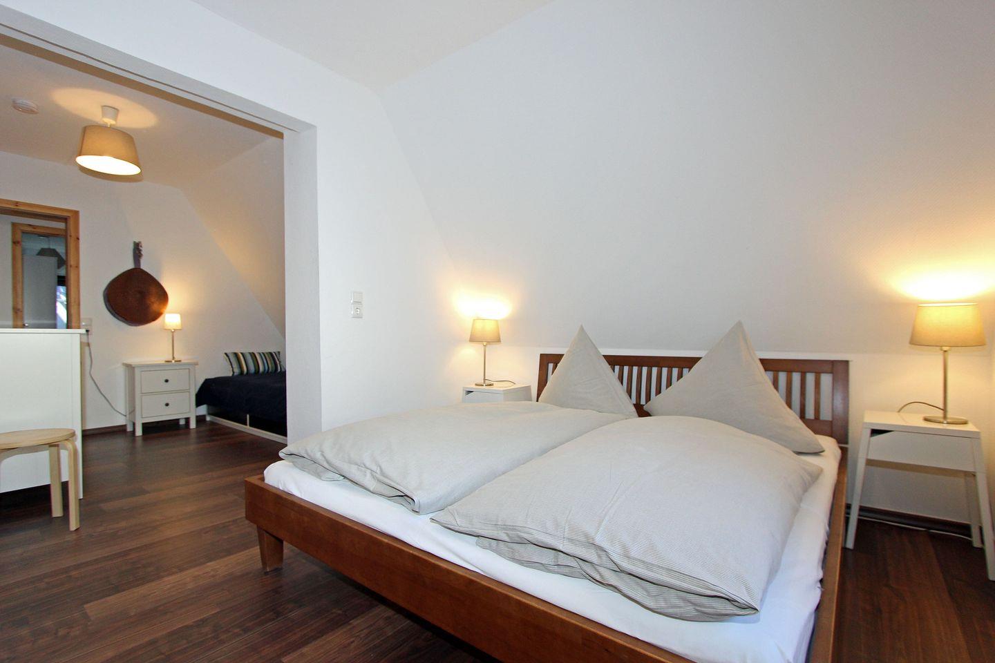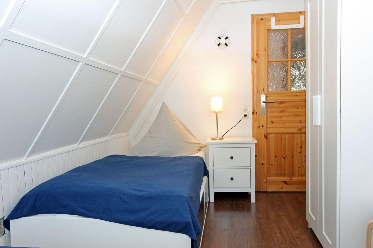 Über eine schmale Holztreppe gelangen Sie in das gut ausgestattete Obergeschoss. Wir empfehlen ggf. die Treppenschutzgitter zu verwenden. Von hier aus gelangen Sie in die 3 Schlafzimmer und das helle Badezimmer mit Dusche.