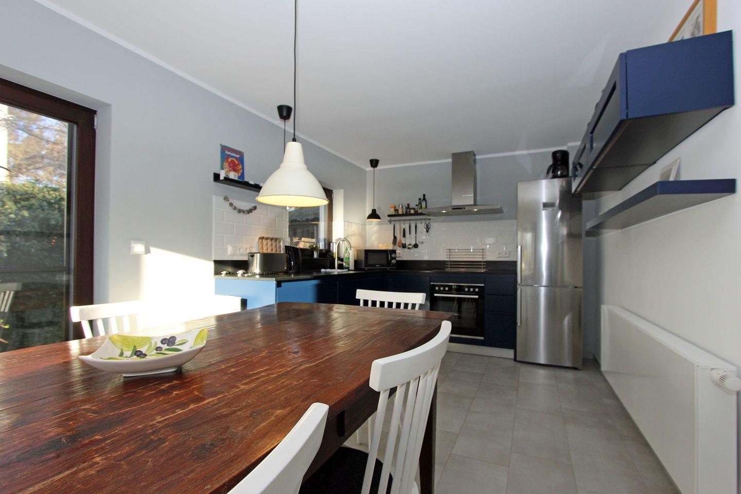 Die moderne und komplett ausgestattete Küche lässt keine Wünsche offen und der große Esstisch bietet ausreichend Platz für die gemeinschaftlichen Mahlzeiten.