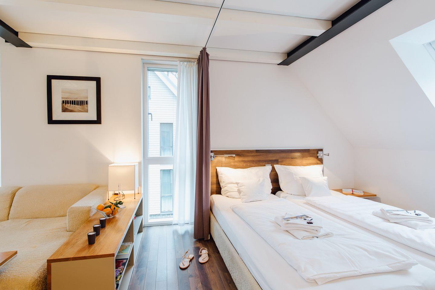 Die Maisonette-Ferienwohnung eignet sich für bis zu drei Personen und bietet auf zwei Ebenen ein lichtdurchflutetes Raumgefühl mit klarer Gestaltung.