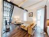 Über eine Treppe gelangt man in den oberen Bereich unter dem Dach, wo ein weiteres Bett Platz findet. Hier entsteht ein besonderer Rückzugsort mit Blick in den Himmel – ruhig, abgeschirmt und atmosphärisch.