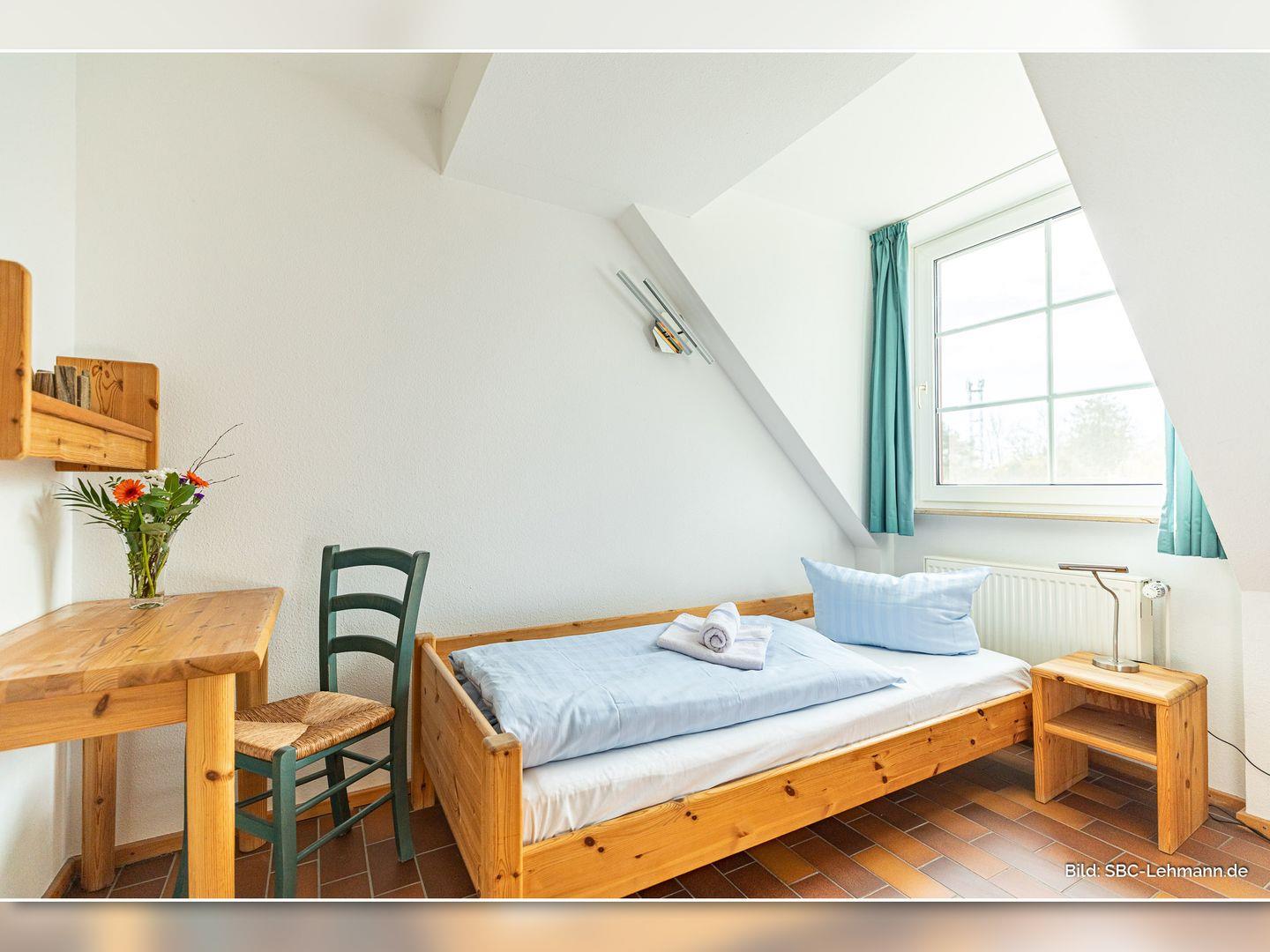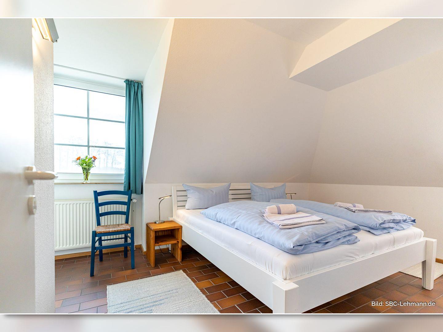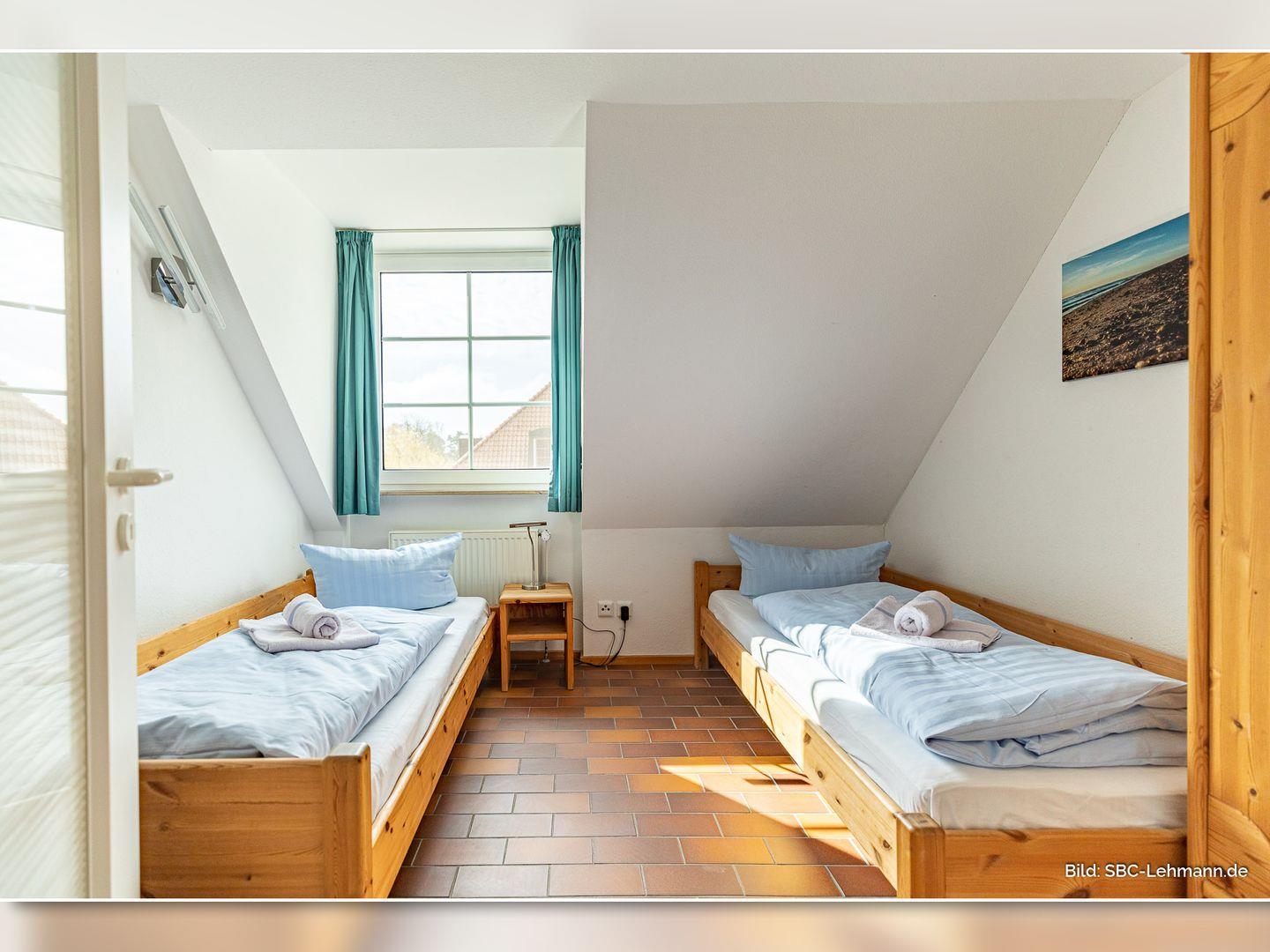 Im Dachgeschoss liegen die zwei Schlafzimmer – eines mit Doppelbett, eines mit zwei Einzelbetten – sowie ein weiteres Duschbad mit WC.