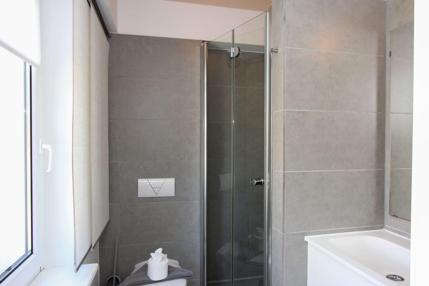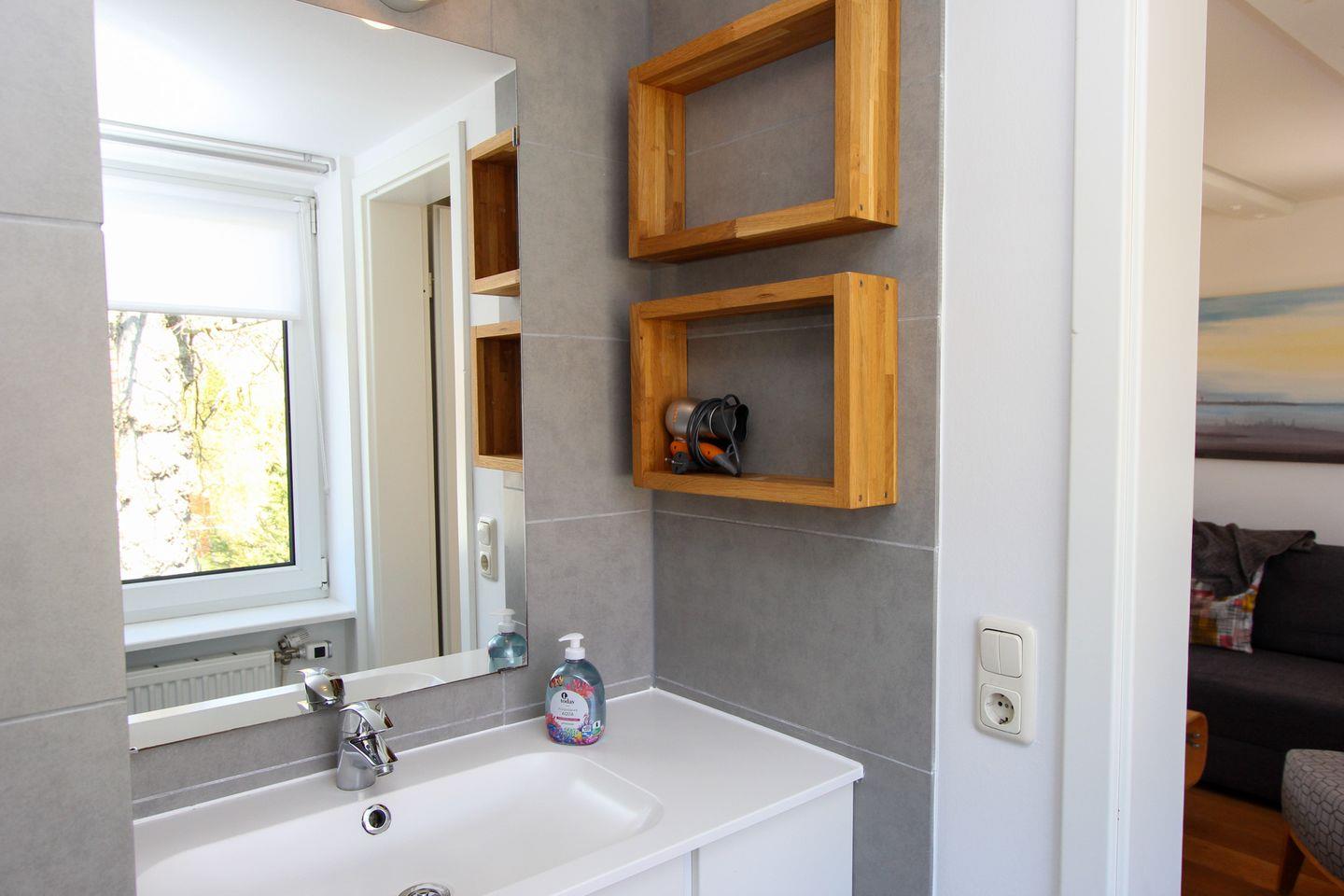Das Badezimmer der Ferienwohnung verfügt über eine bodengleiche Dusche, ein Waschbecken und WC.