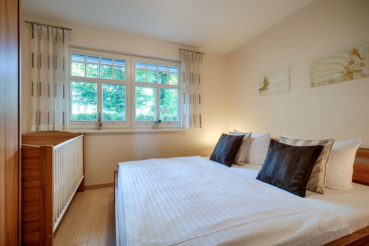 1 Schlafzimmer mit Doppelbett (1,80x2,00m), mit verstellbaren Lattenrosten, festes Kinderbett inkl. Matratze und Bettwäsche