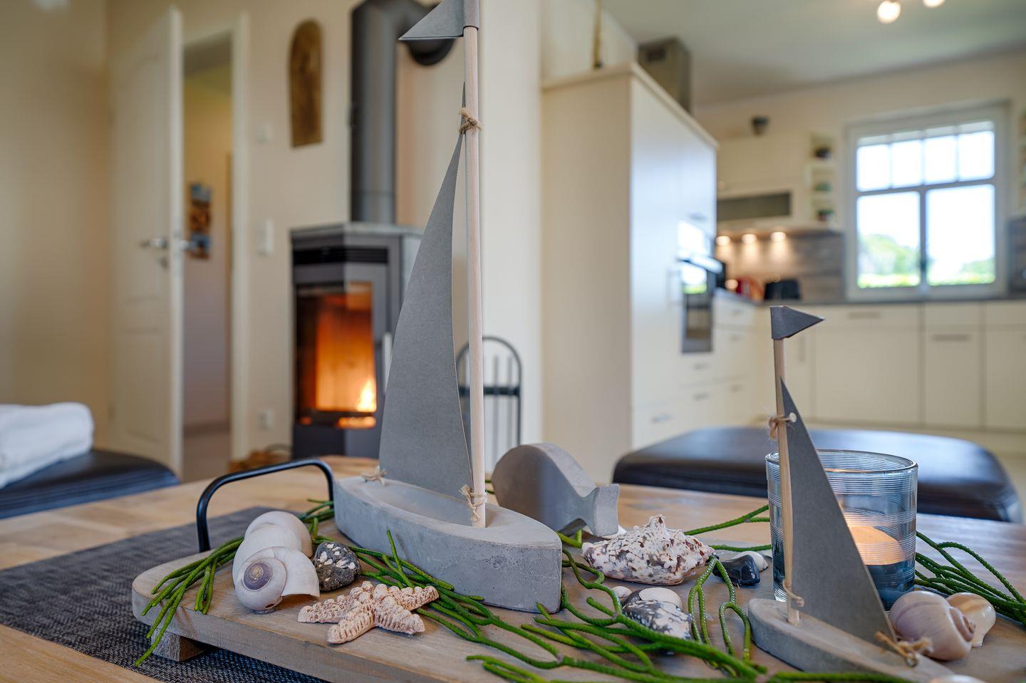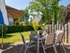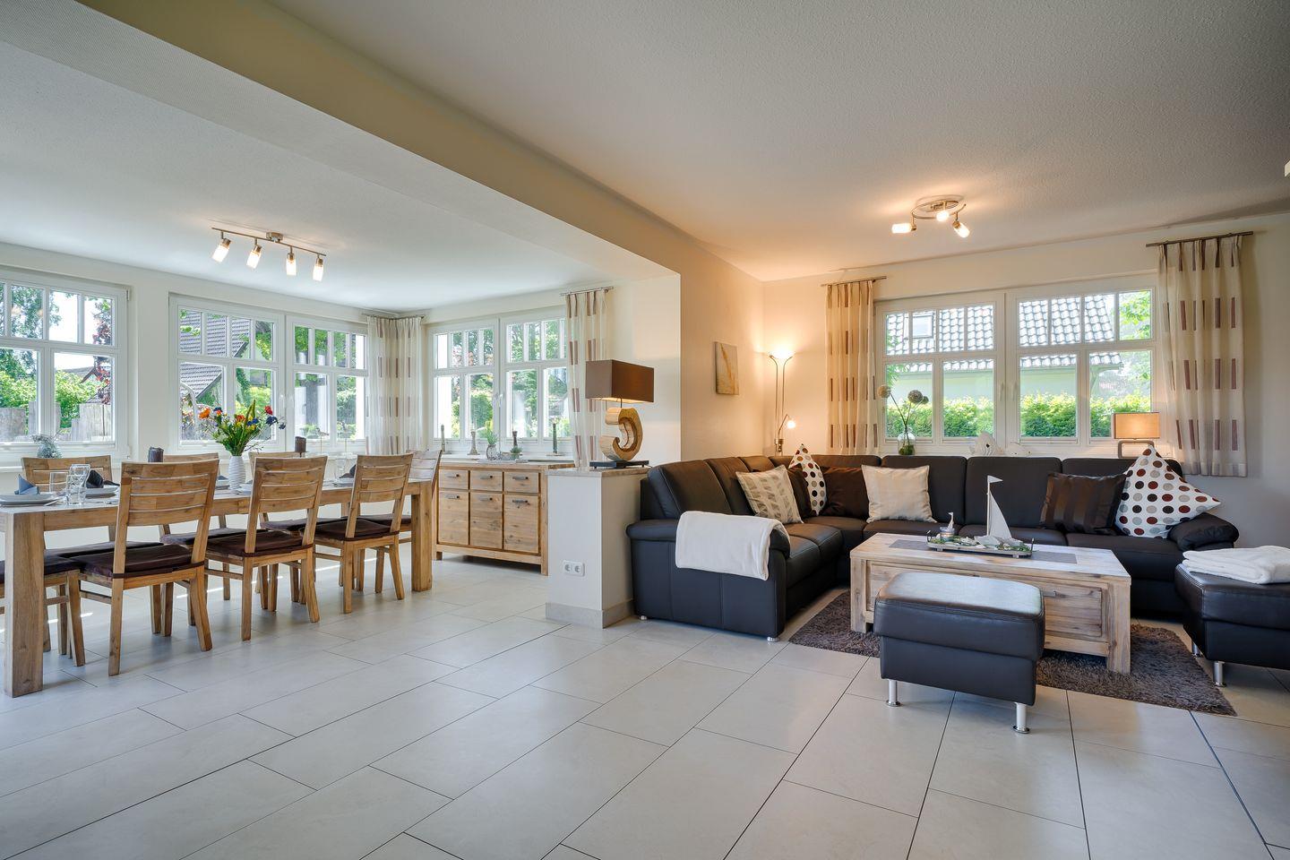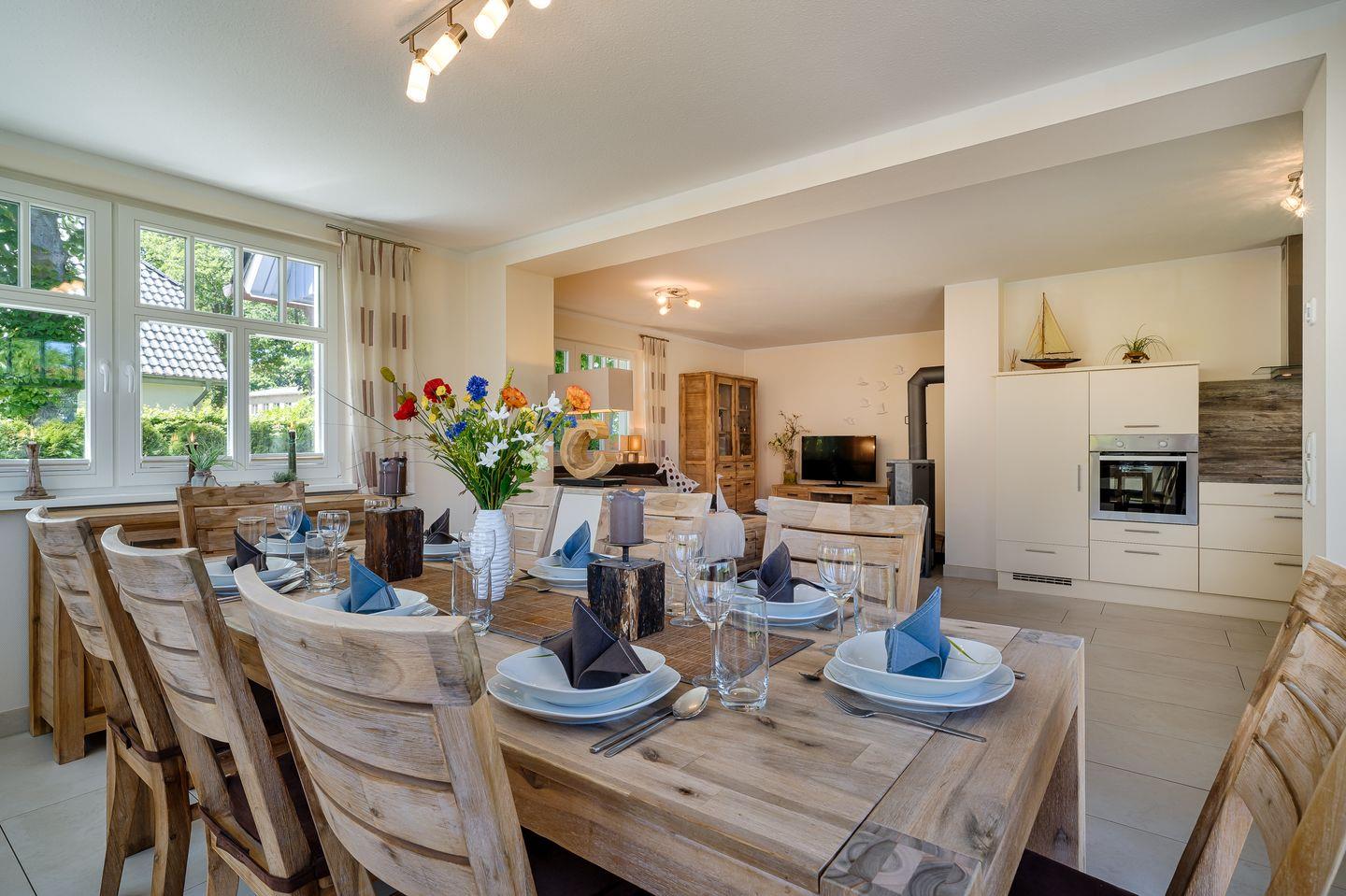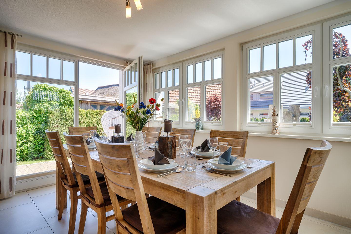 Essbereich mit Esstisch in der Darß-Veranda mit Gartenblick