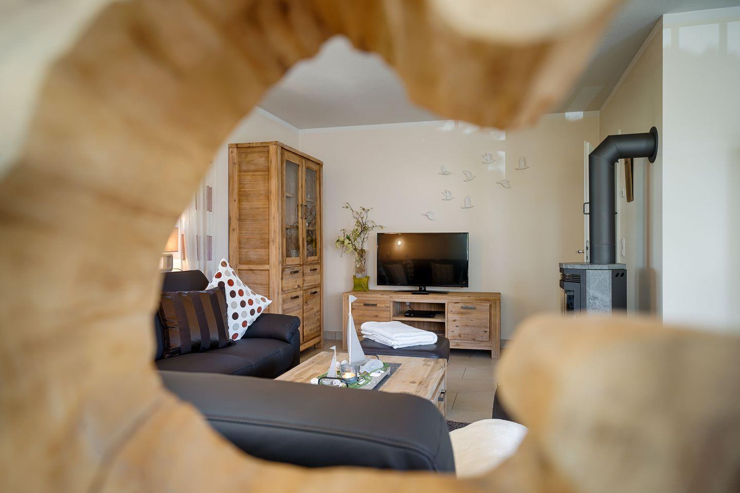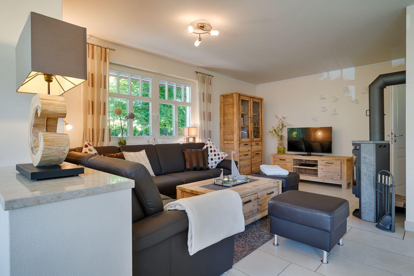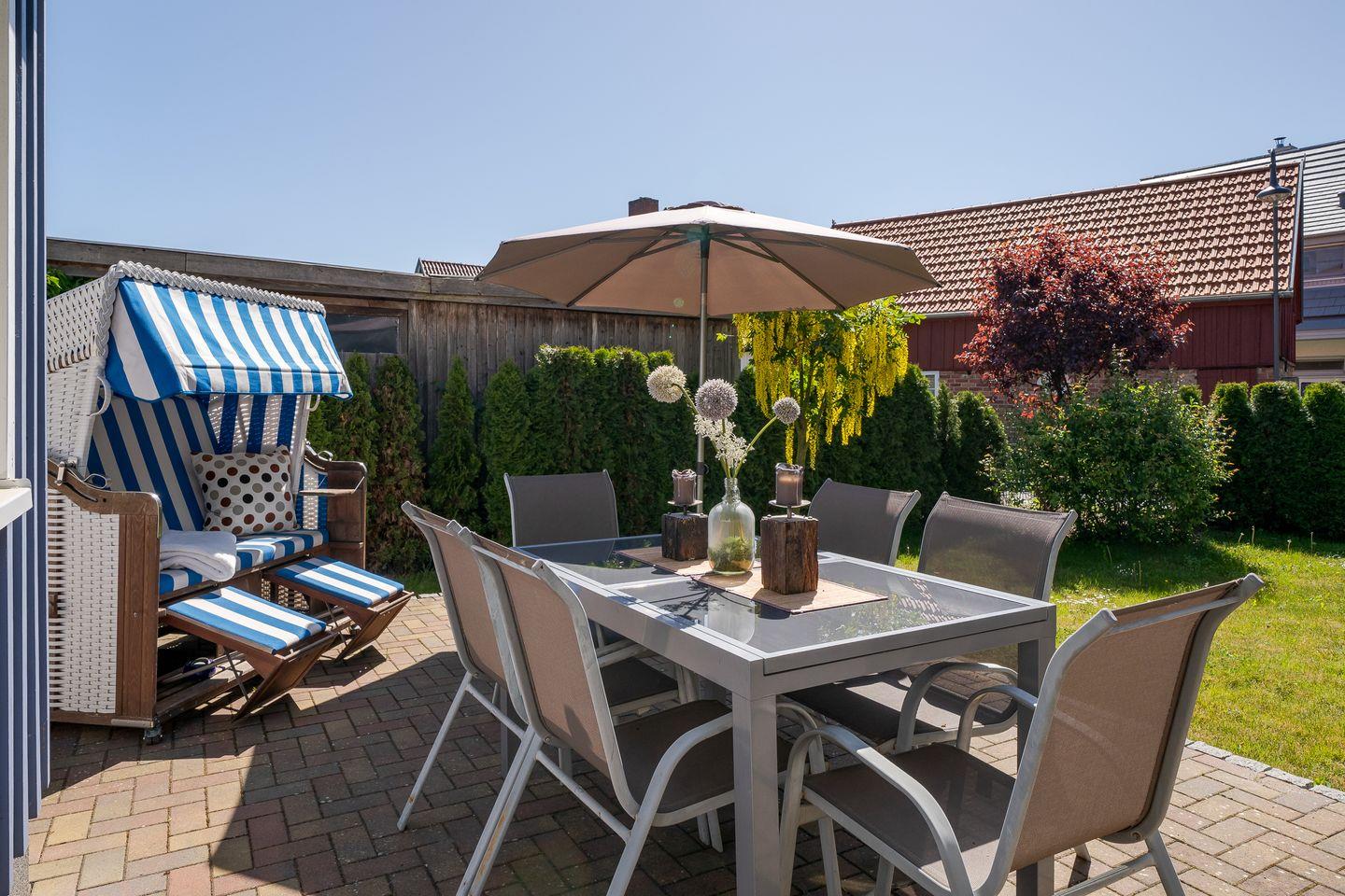 Essbereich mit Esstisch in der Darß-Veranda mit Gartenblick