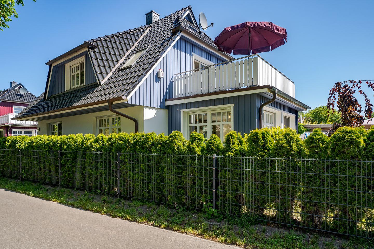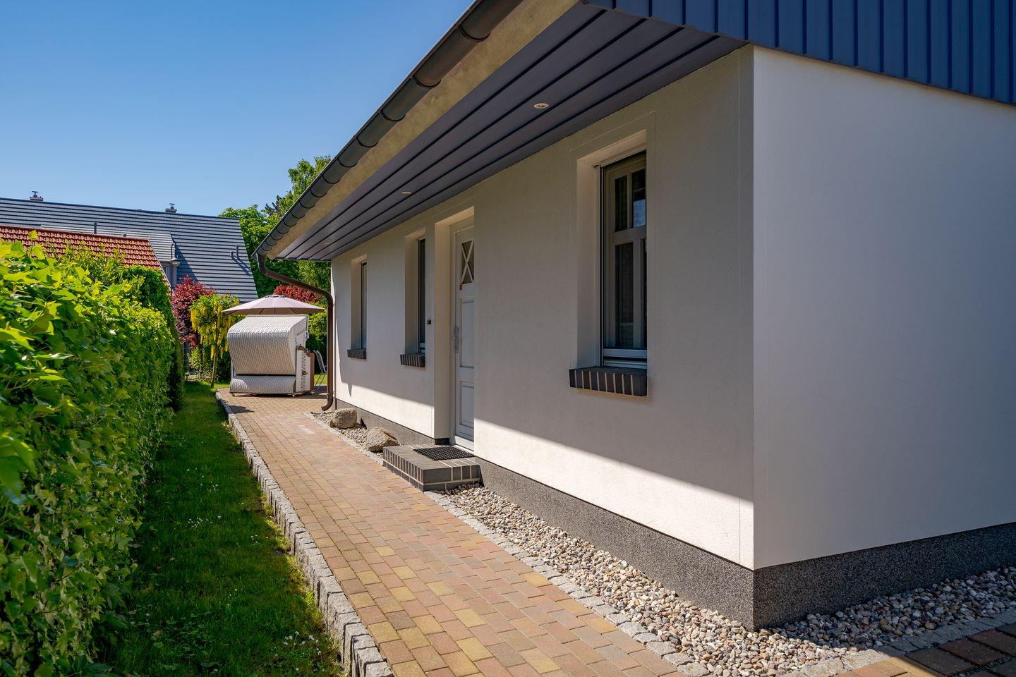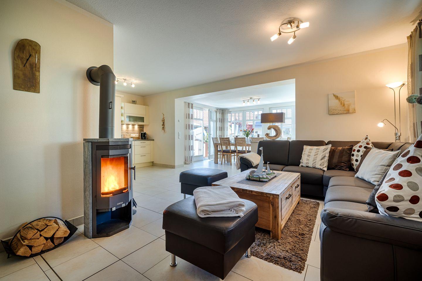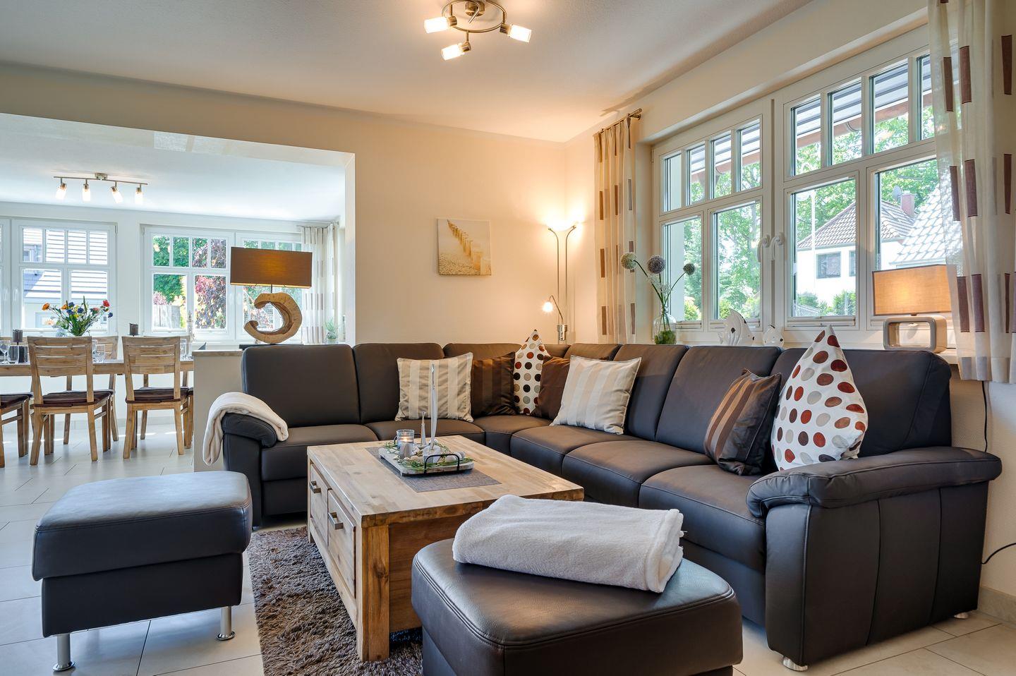 Essbereich mit Esstisch in der Darß-Veranda mit Gartenblick