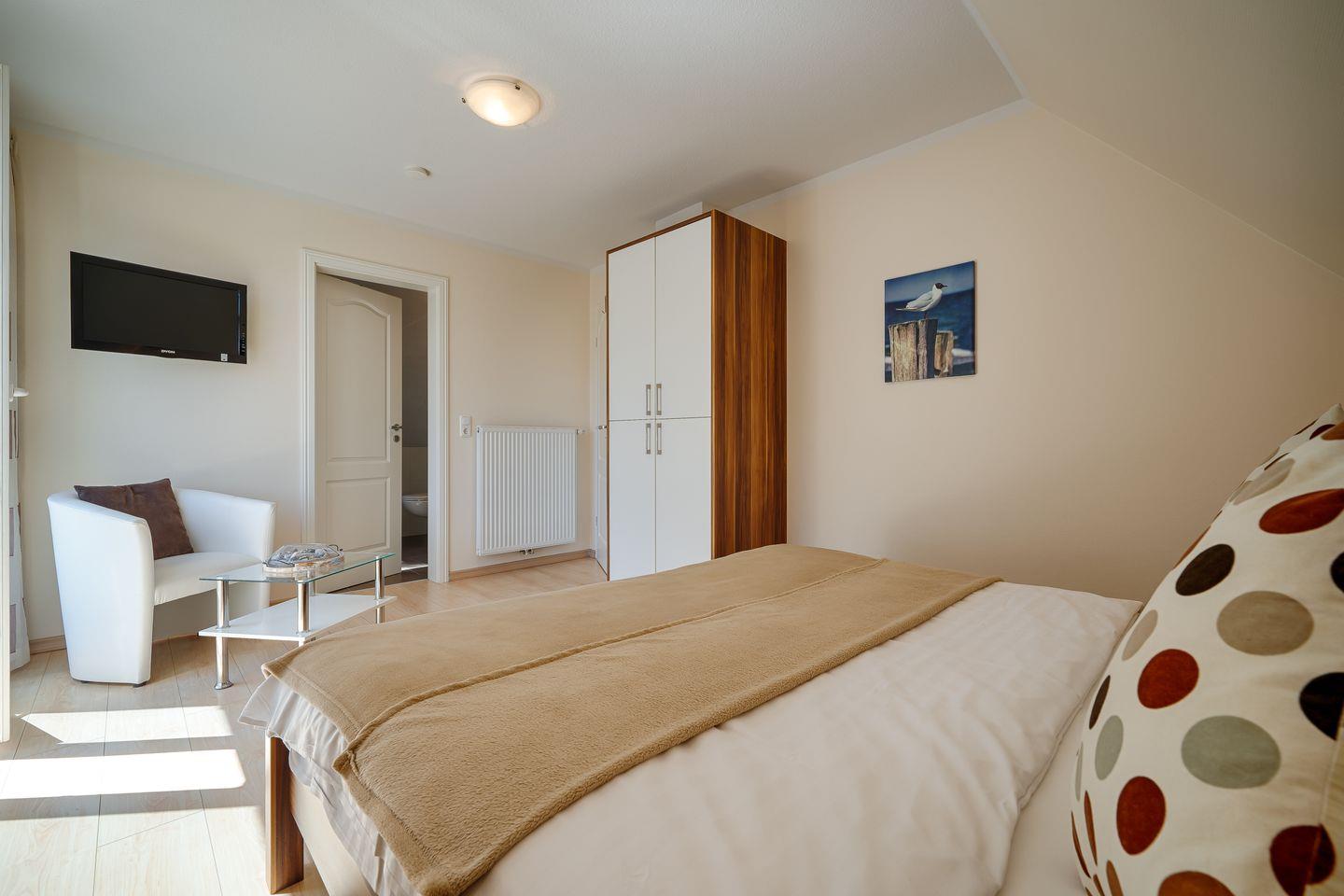 1 Schlafzimmer mit Doppelbett (1,80x2,00m), mit verstellbaren Lattenrosten, eigenem Bad mit Dusche, Whirlwanne, LCD-Sat-TV, Zugang zur Dachterrasse (Südseite)