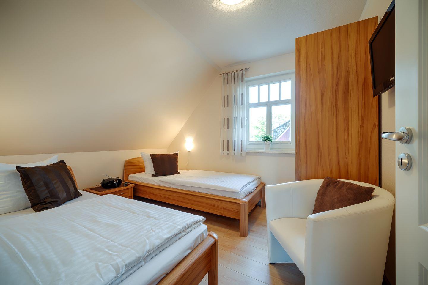 1 Schlafzimmer mit 2 Einzelbetten (0,90x2,00m), mit verstellbaren Lattenrosten, LCD-Sat-TV