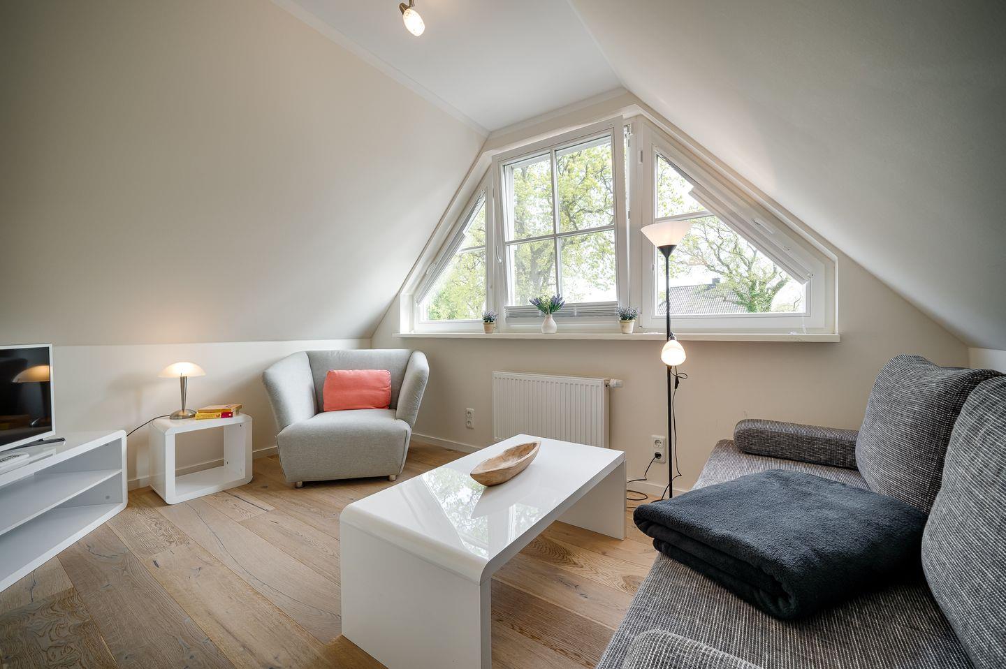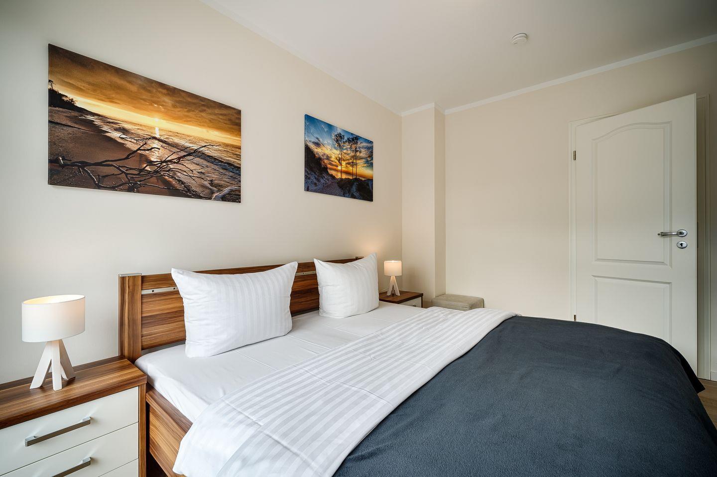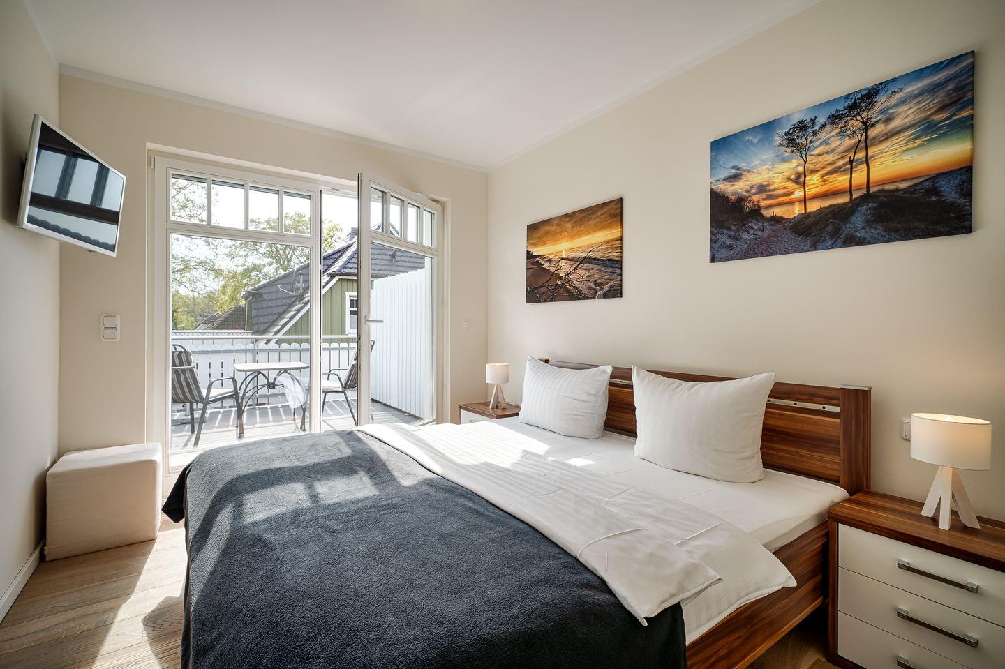 1 Schlafzimmer mit Doppelbett (1,80x2,00m), verstellbare Lattenroste, LED-HD-TV, Zugang zur Dachterrasse