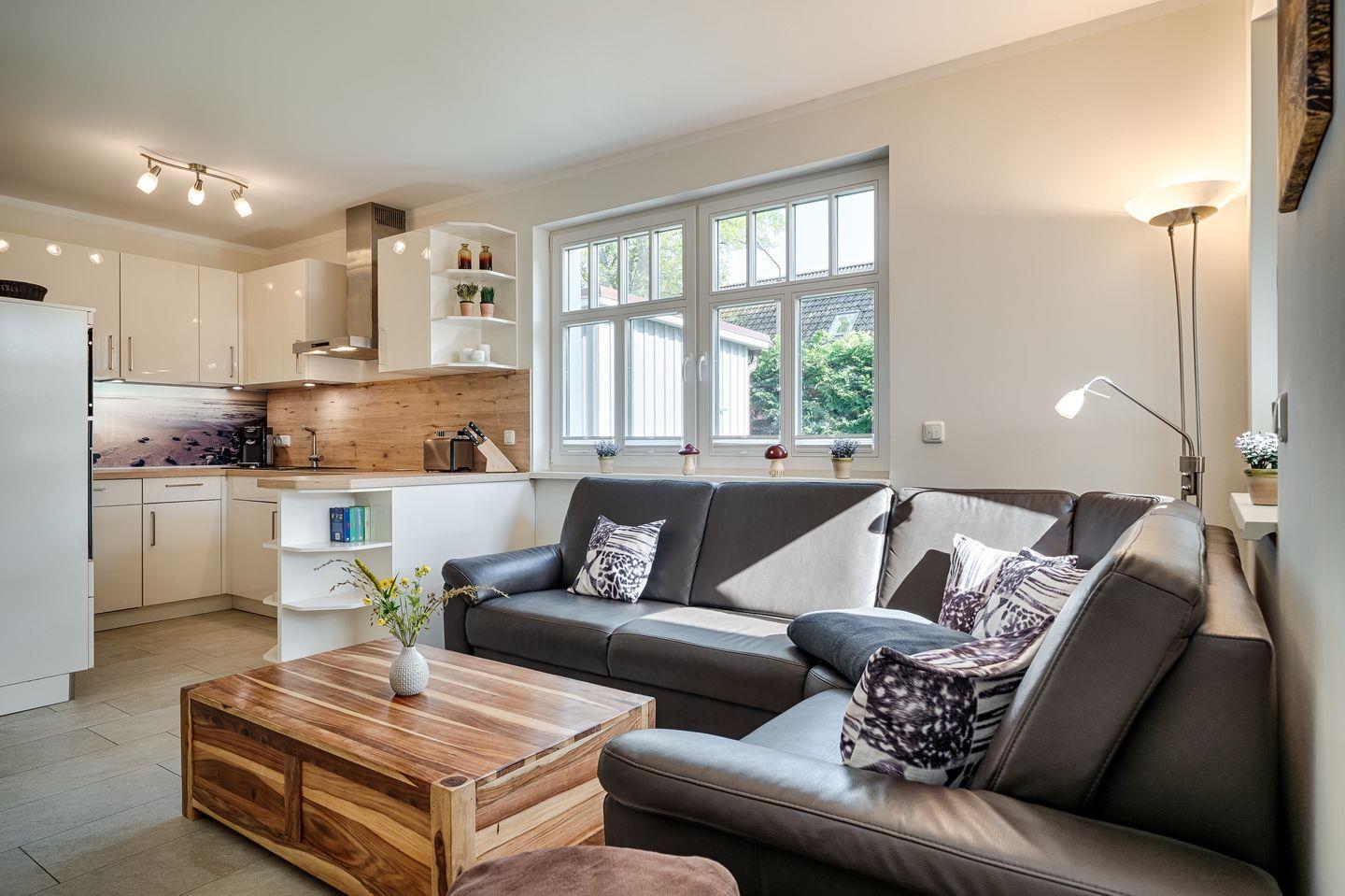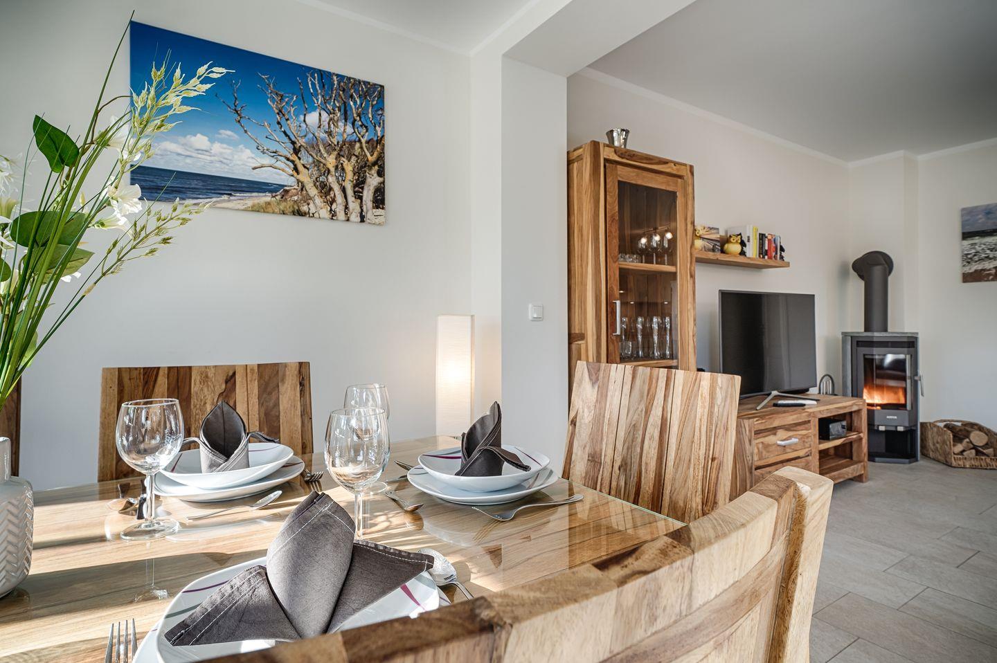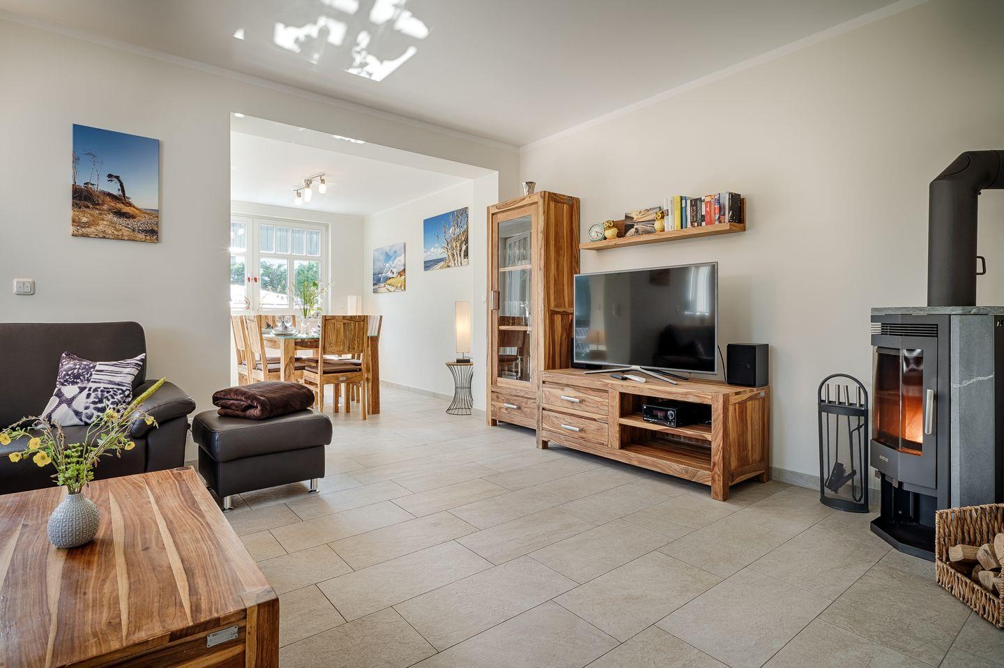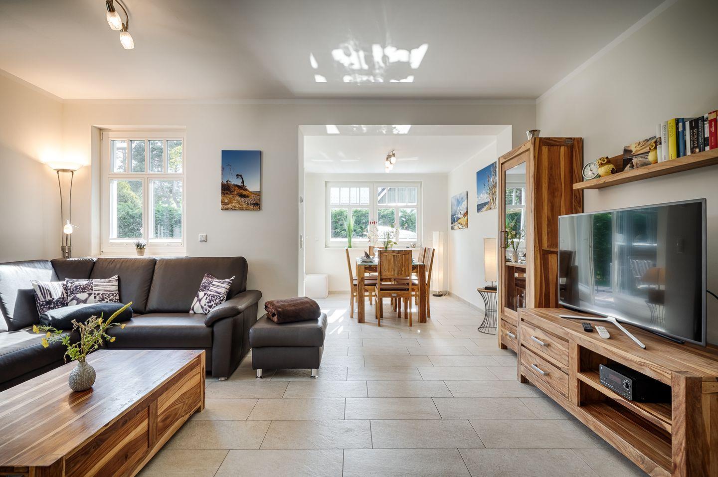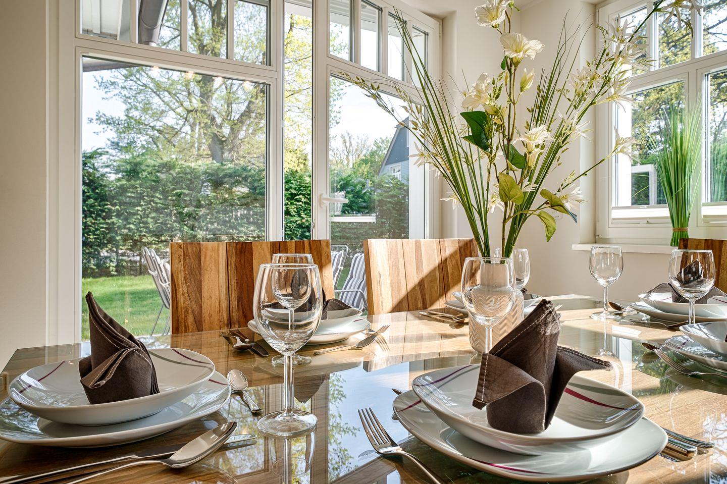 Wohnraum mit Couch-Ecke, Esstisch für 6 Personen im Wintergarten