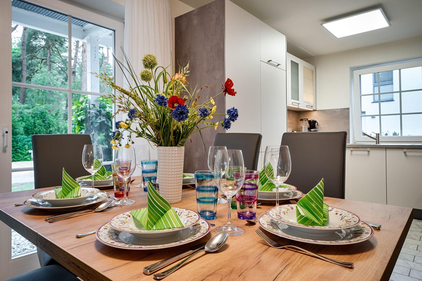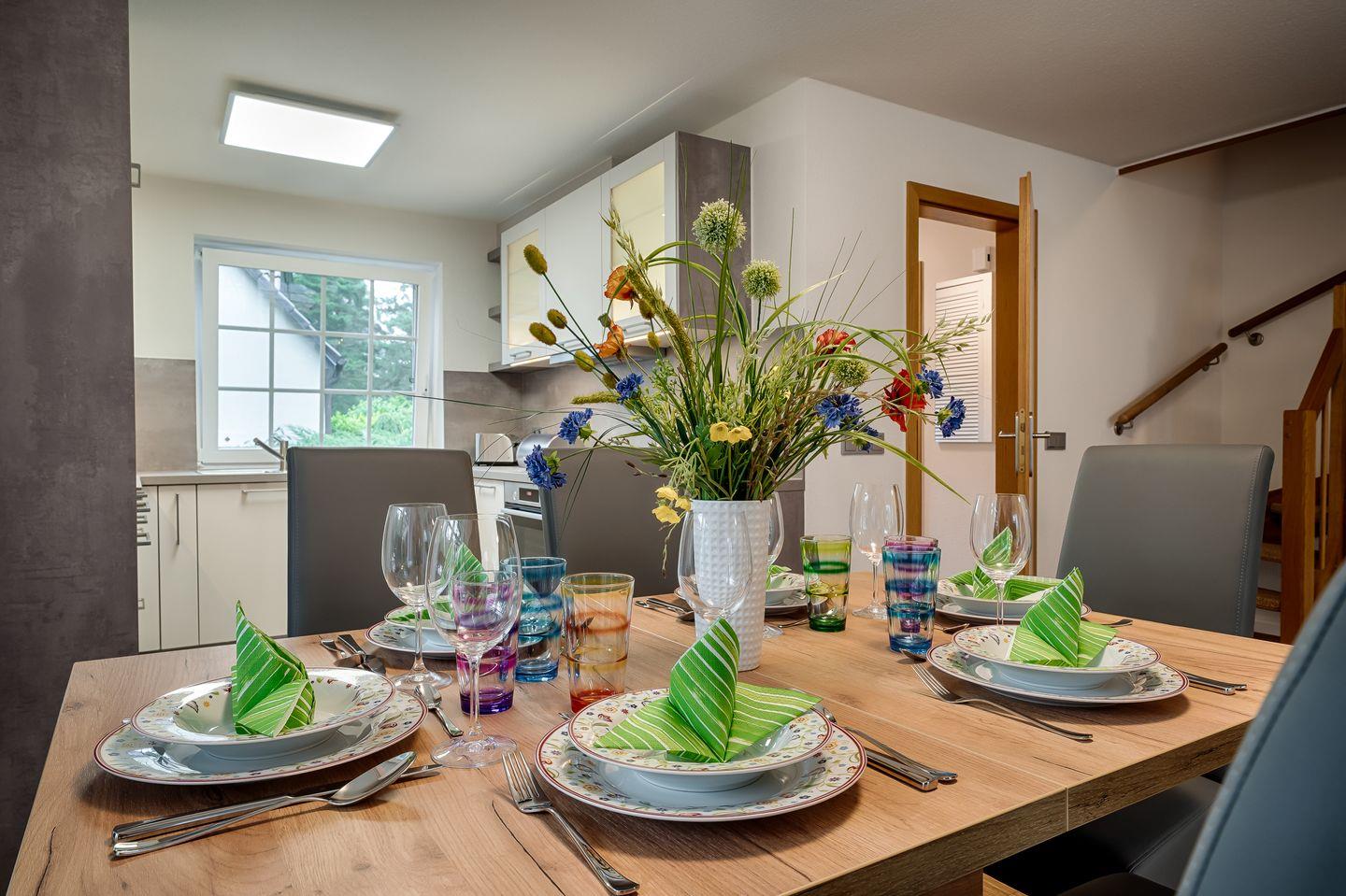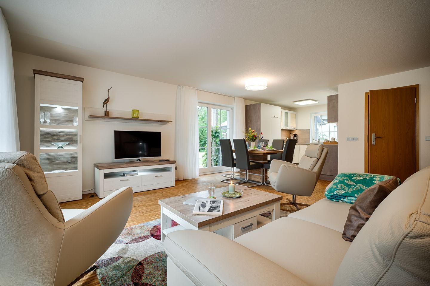 Wohnraum mit Couch, Sessel und Couchtisch, Esstisch für 4 Personen