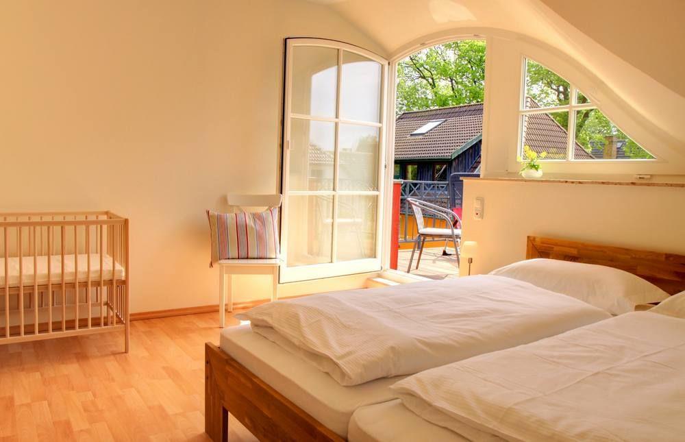 1 Schlafzimmer mit Doppelbett (1,80x2,00m) , Sat-TV und Balkon (Süden)