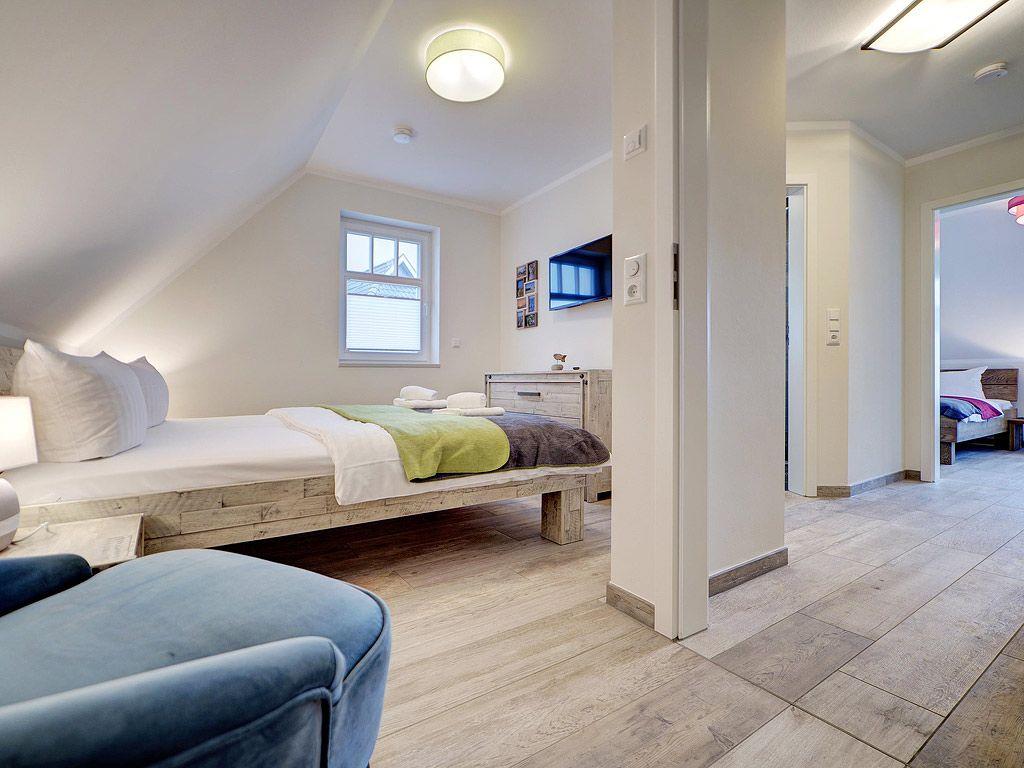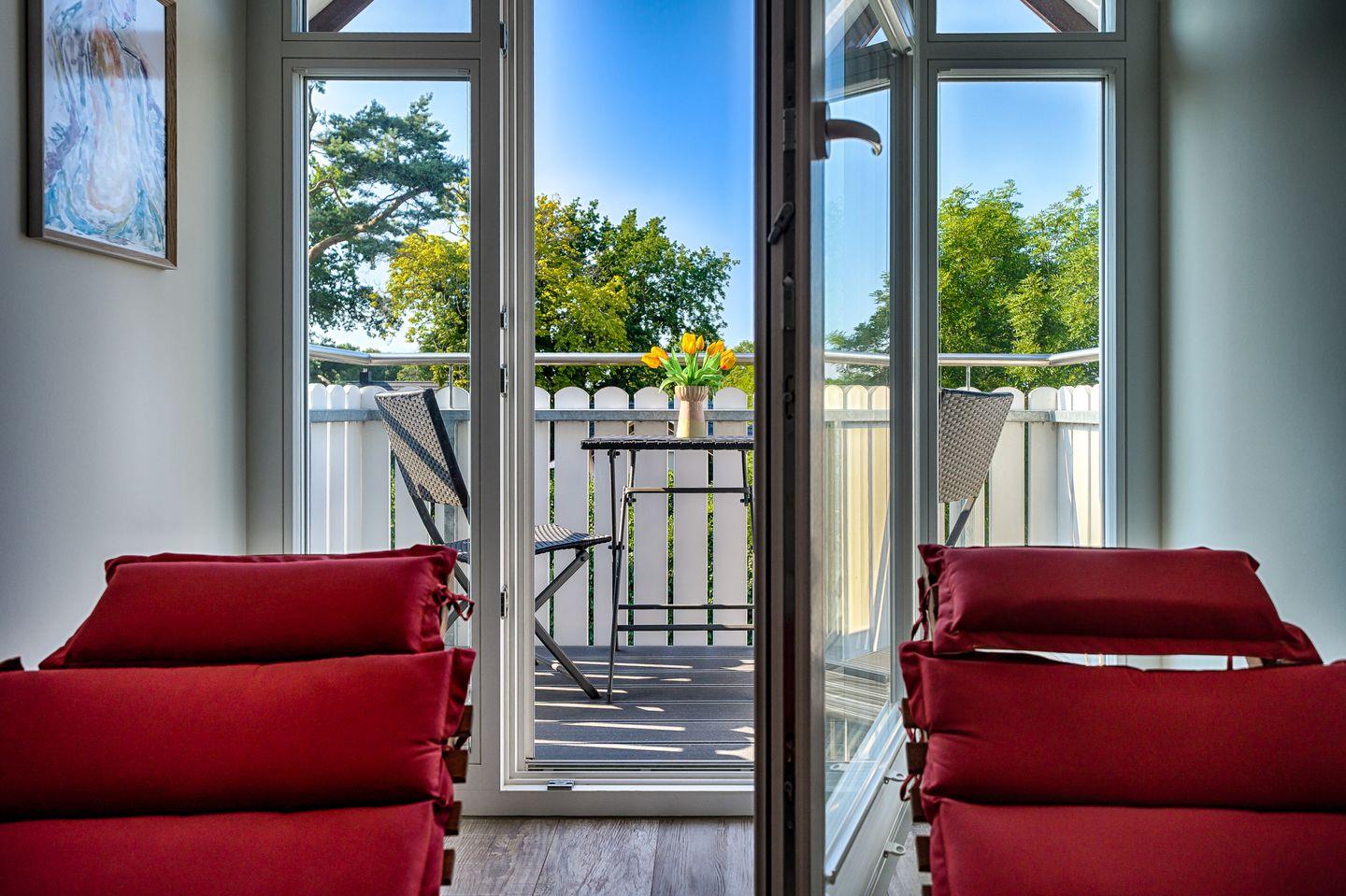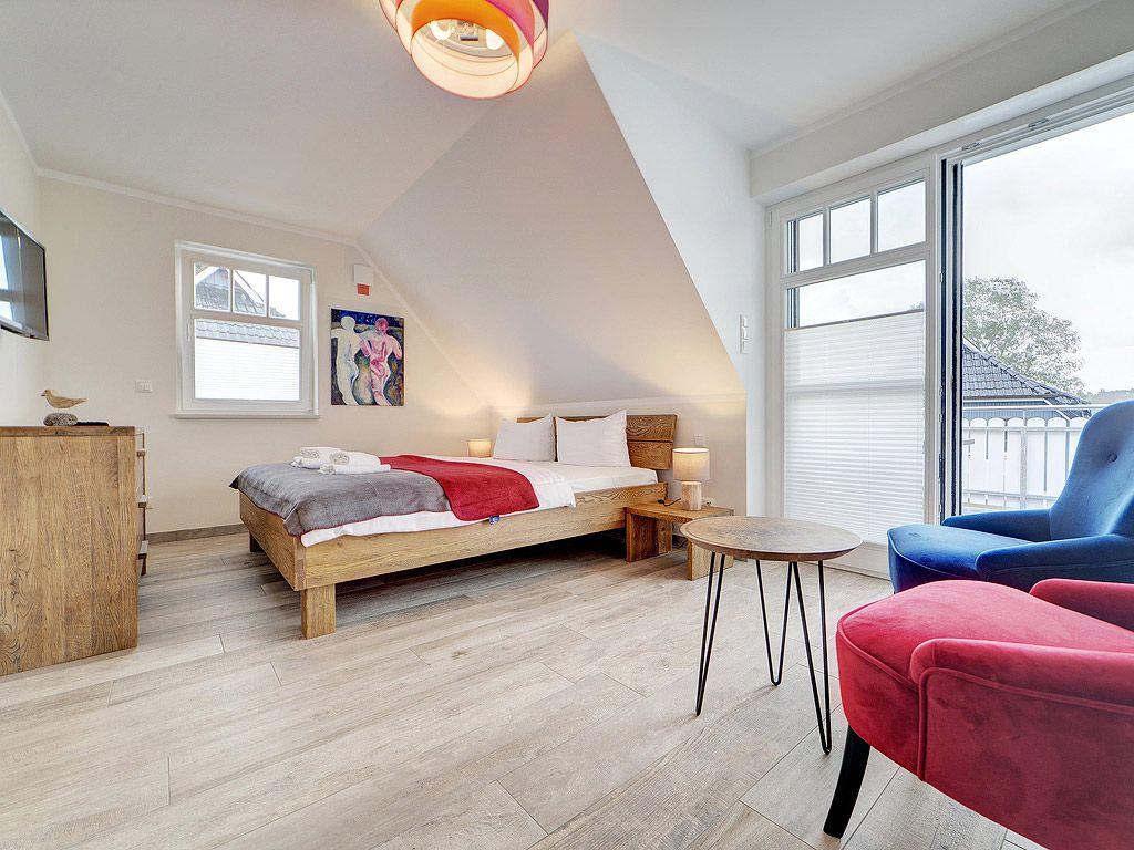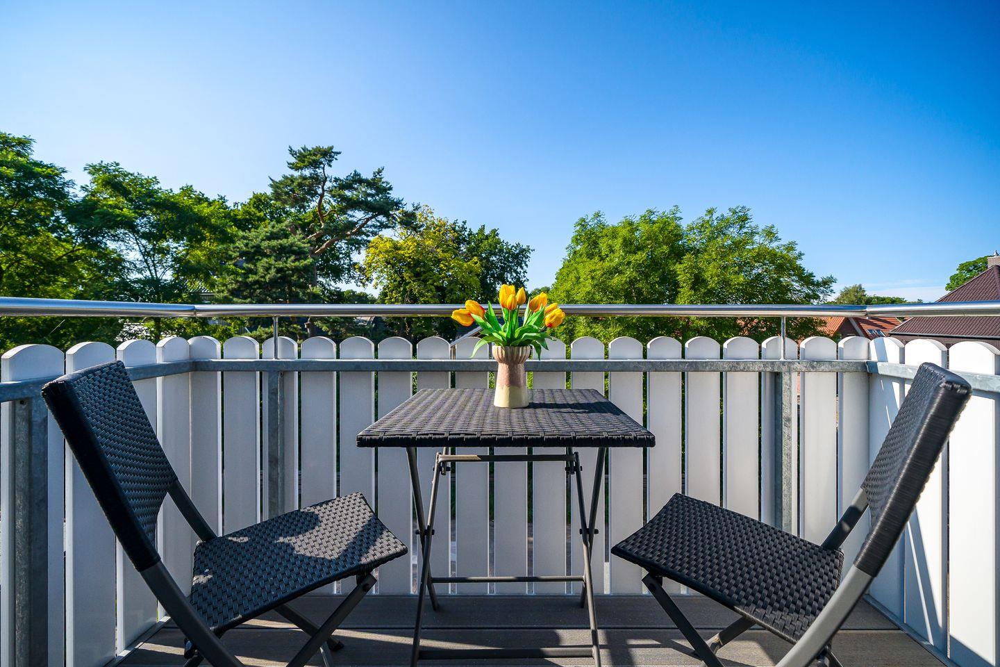 1 Schlafzimmer mit Doppelbett (1,80 x 2,00 m) TV, Zugang zum großzügigen Süd-Balkon mit Gartenmöbeln