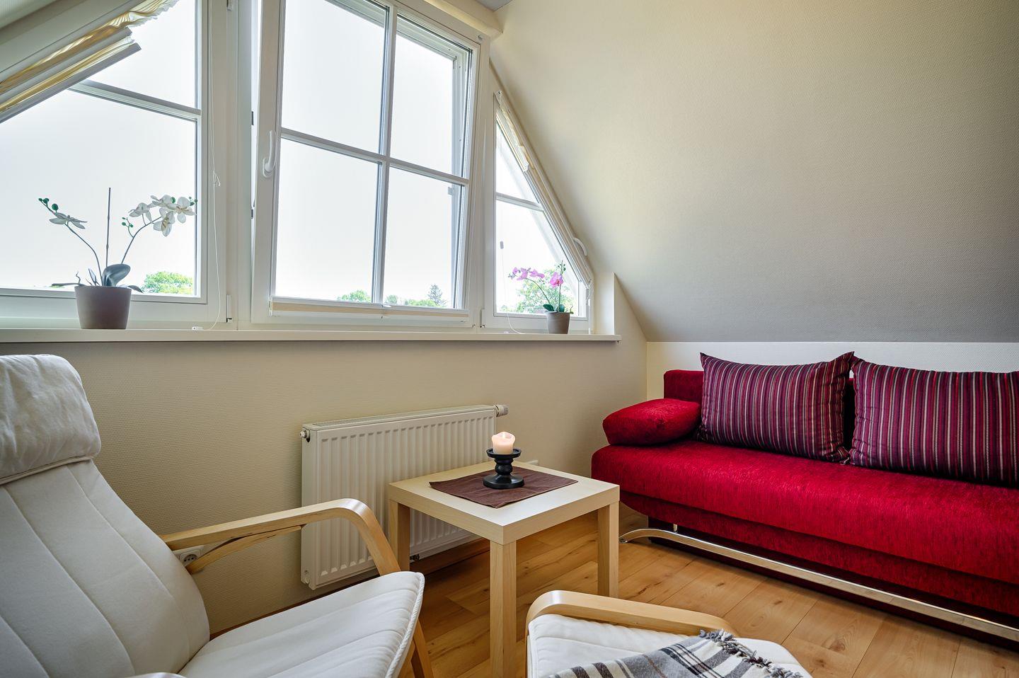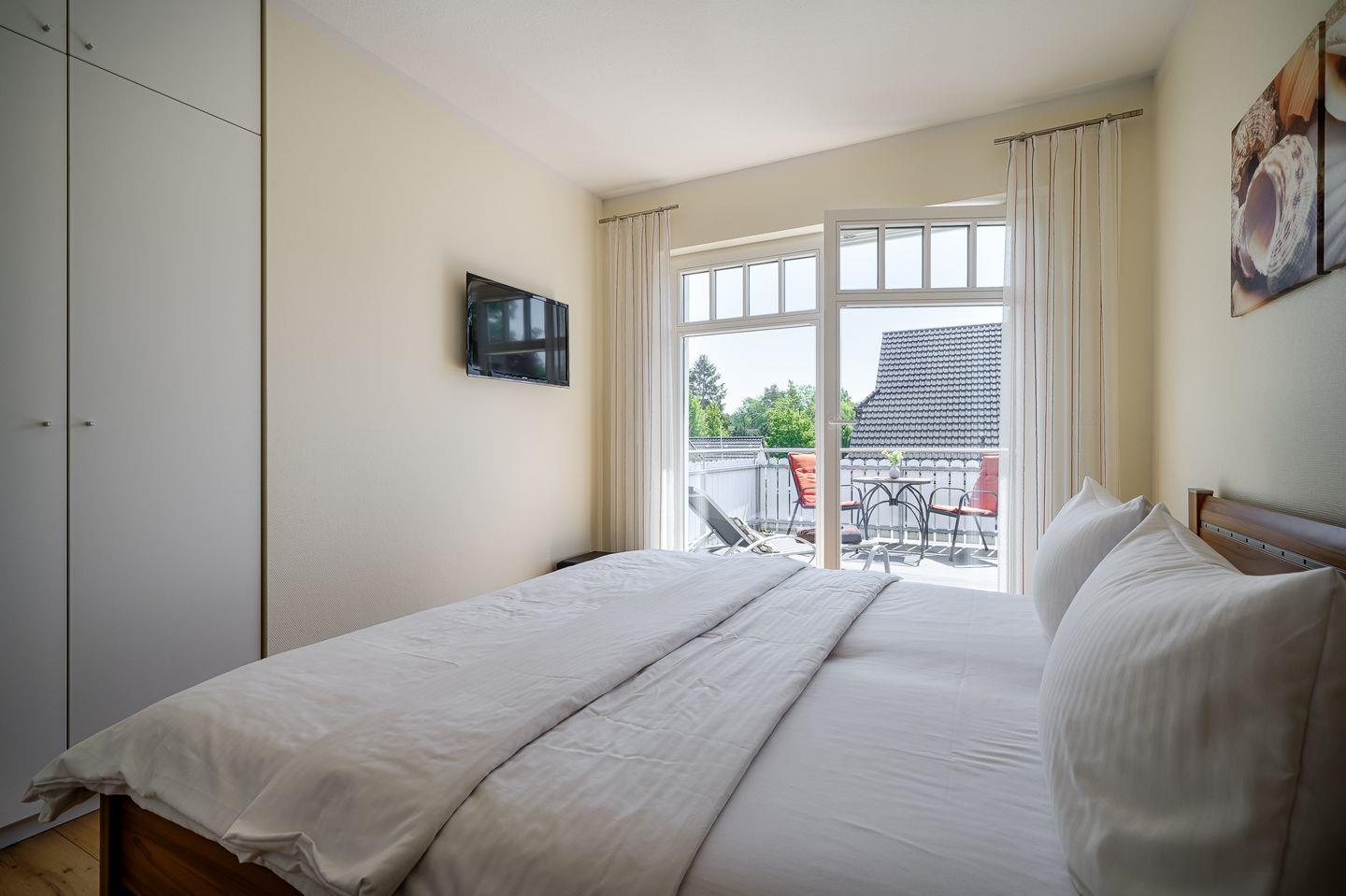 1 Schlafzimmer mit Doppelbett (1,80x2,00m), verstellbare Lattenroste, TV, Zugang zur Dachterrasse