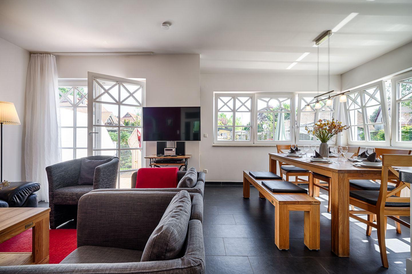 kombinierter Wohn- und Essbereich mit Ledercouch und Esstisch für 6 Personen