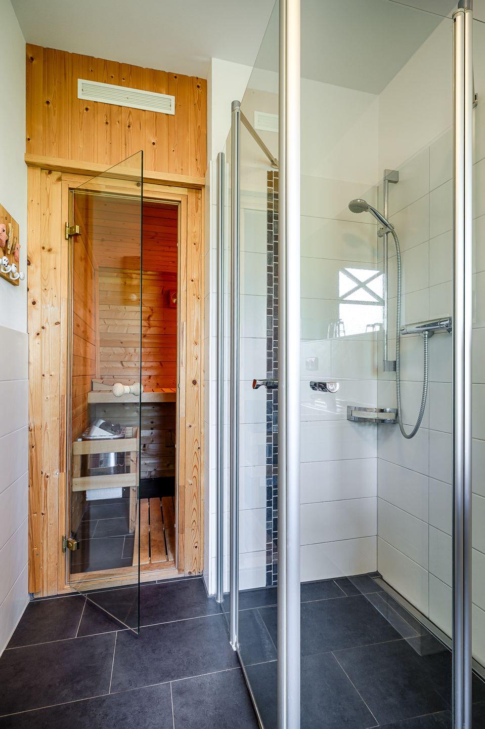 Bad mit ebenerdiger Dusche und anliegender Münzsauna (2,-€ pro Stunde)