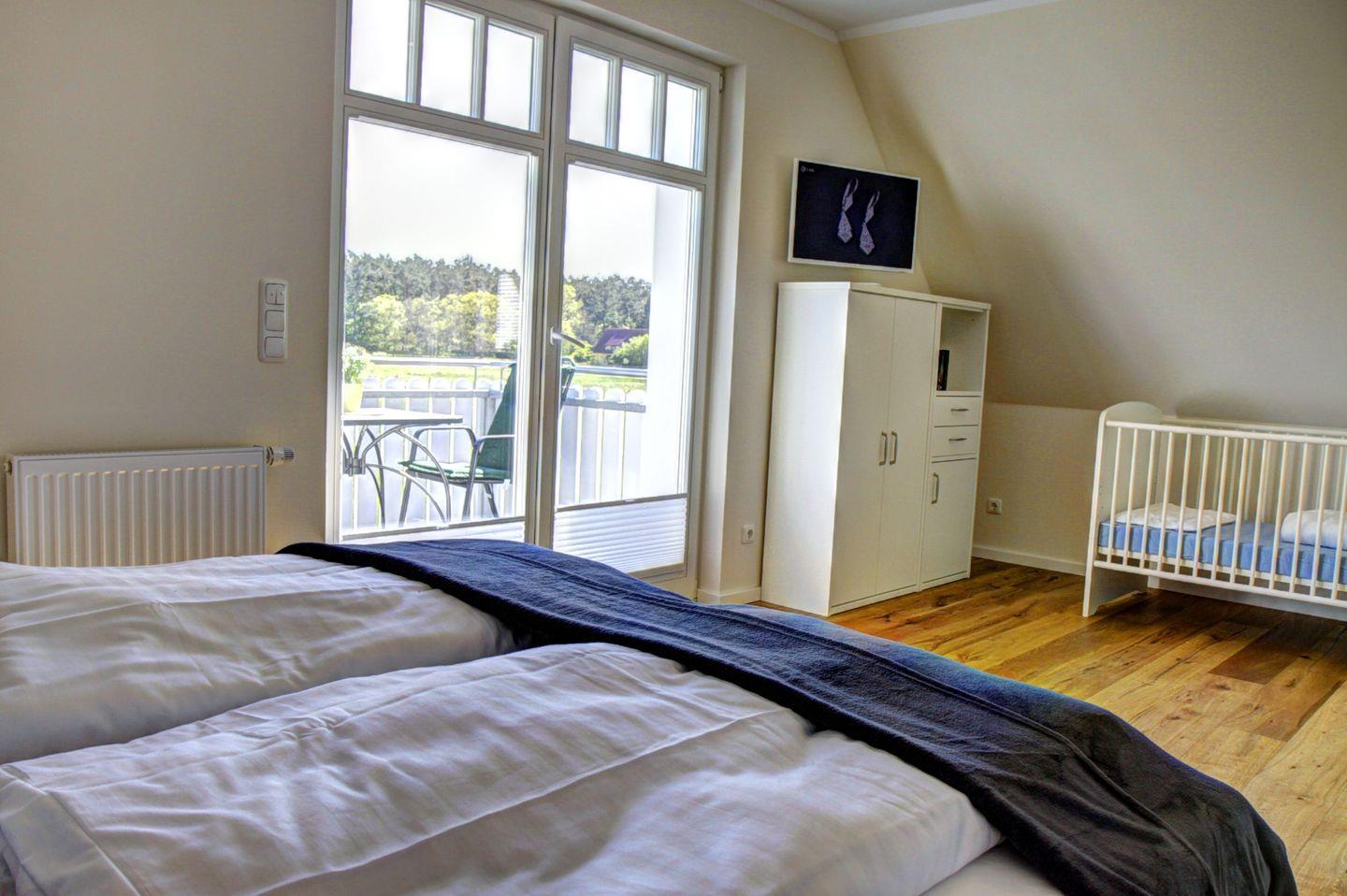 1 Schlafzimmer mit Doppelbett (1,80x2,00 m), verstellbare Lattenroste, Zugang zum Balkon, TV