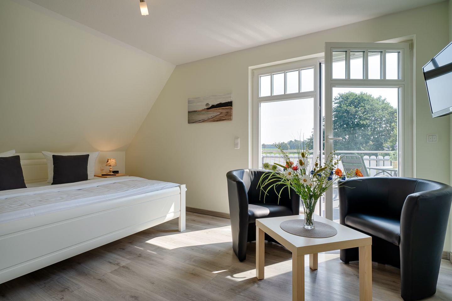 1 Schlafzimmer mit Doppelbett (1,80x2,00m), TV, verstellbare Lattenroste, eigenem Tageslichtbad mit ebenerdiger Dusche & Badewanne und Zugang zur Dachterrasse