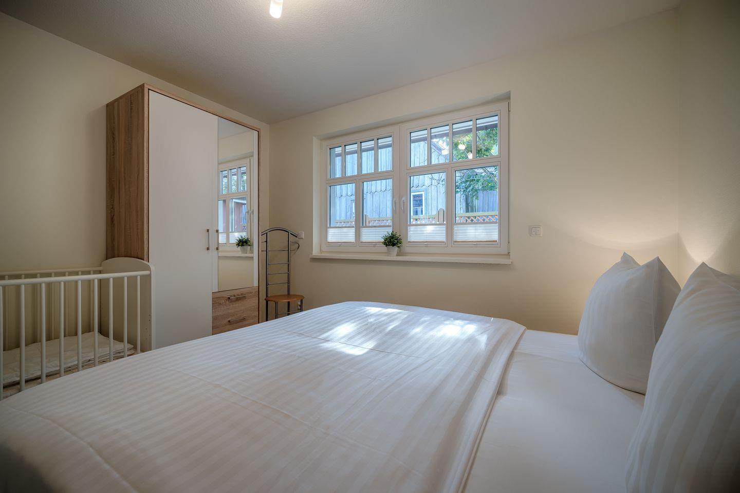 1 Schlafzimmer mit Doppelbett (1,80x2,00 m), verstellbare Lattenroste mit Kindergitterbett (inkl. Bettwäsche)