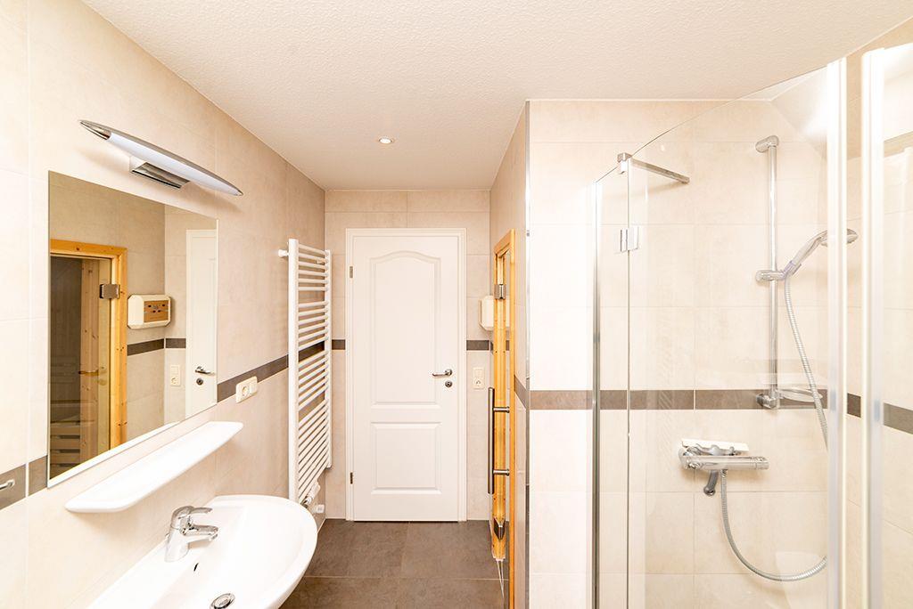 Bad mit ebenerdiger Dusche und Sauna