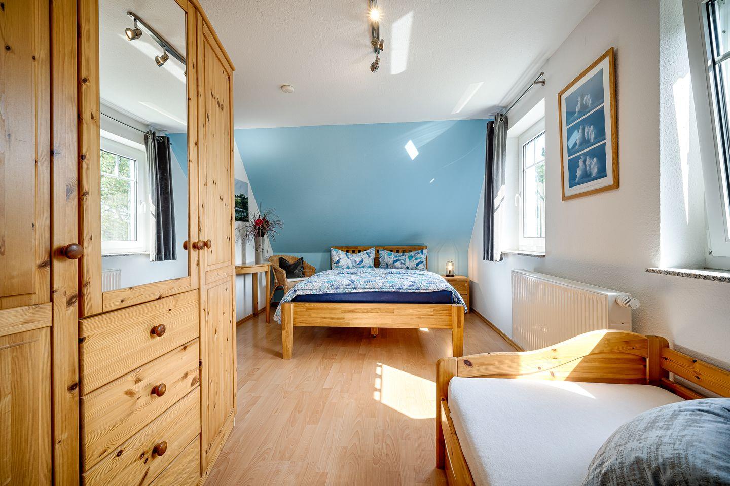1 Schlafzimmer mit einem Einzelbett (0,90x2,00m) inkl. einem weiteren Ausziehbett (0,90x2,00m) und ein Doppelbett (1,40x2,00m)-durchgängige Matratze s