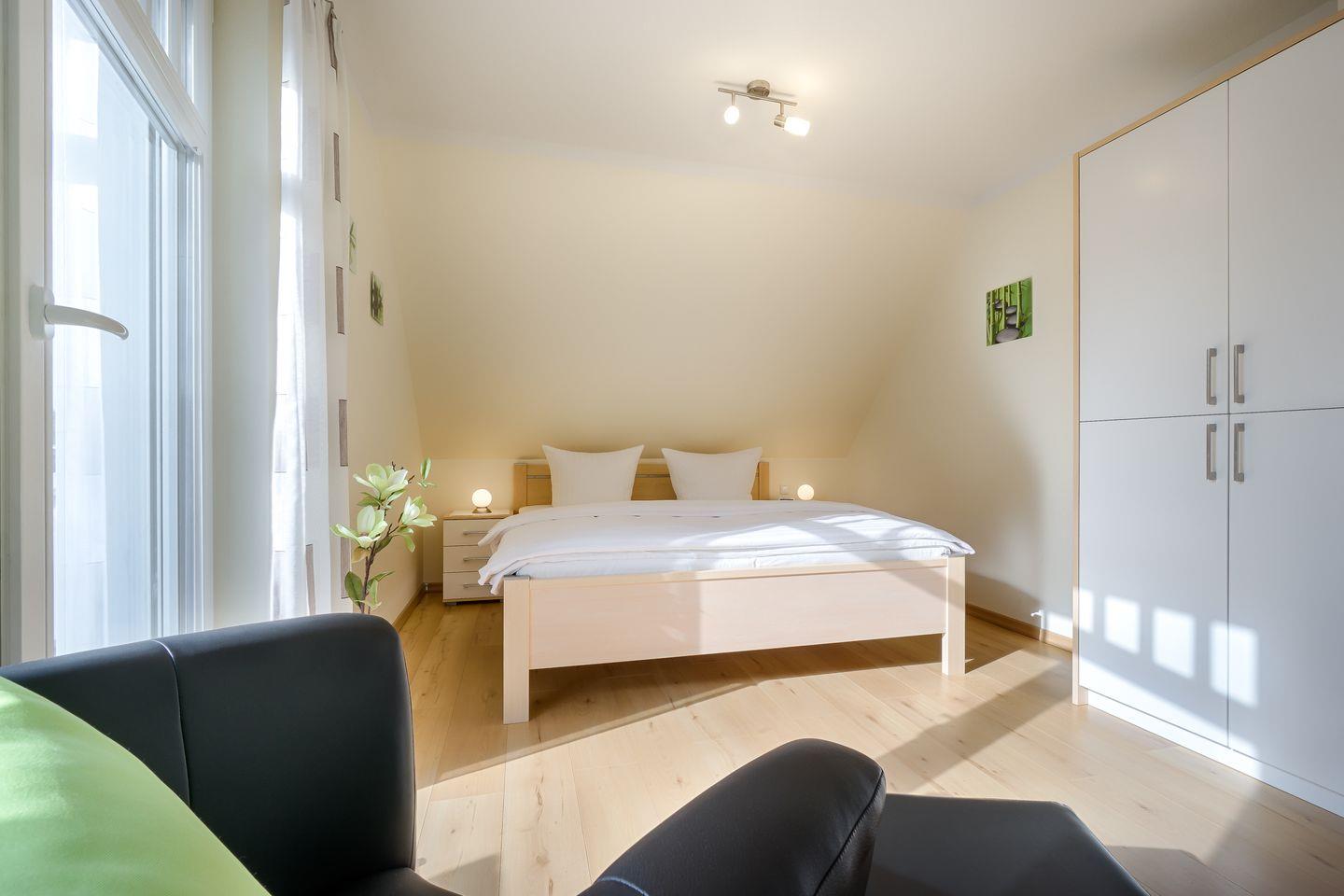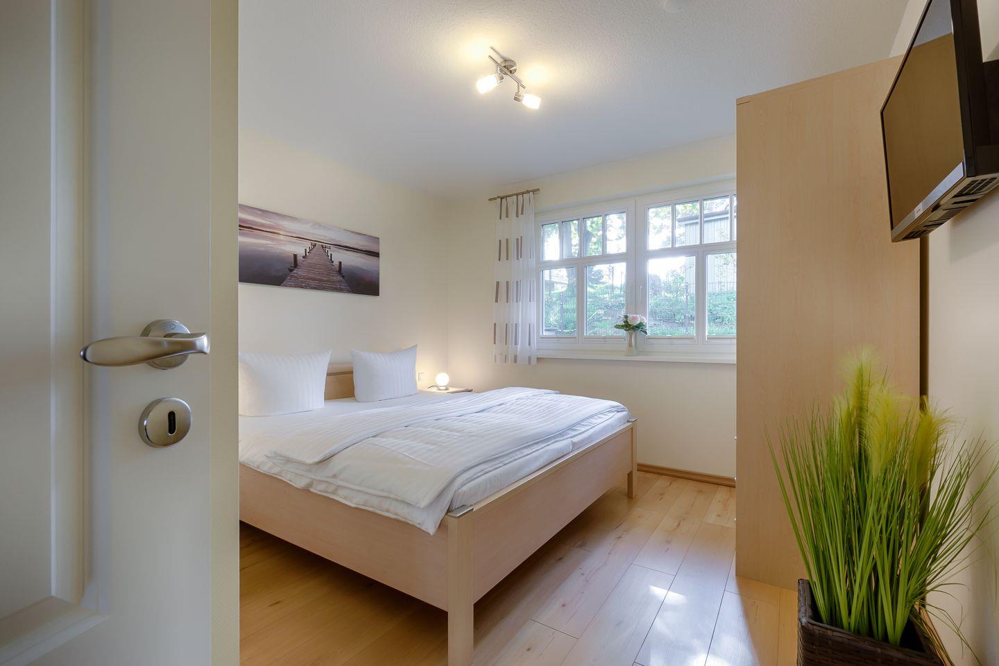 1 Schlafzimmer mit Doppelbett (1,80x2,00m), verstellbare Lattenroste, TV, eigenes Bad mit Wanne/ebenerdiger Dusche ,