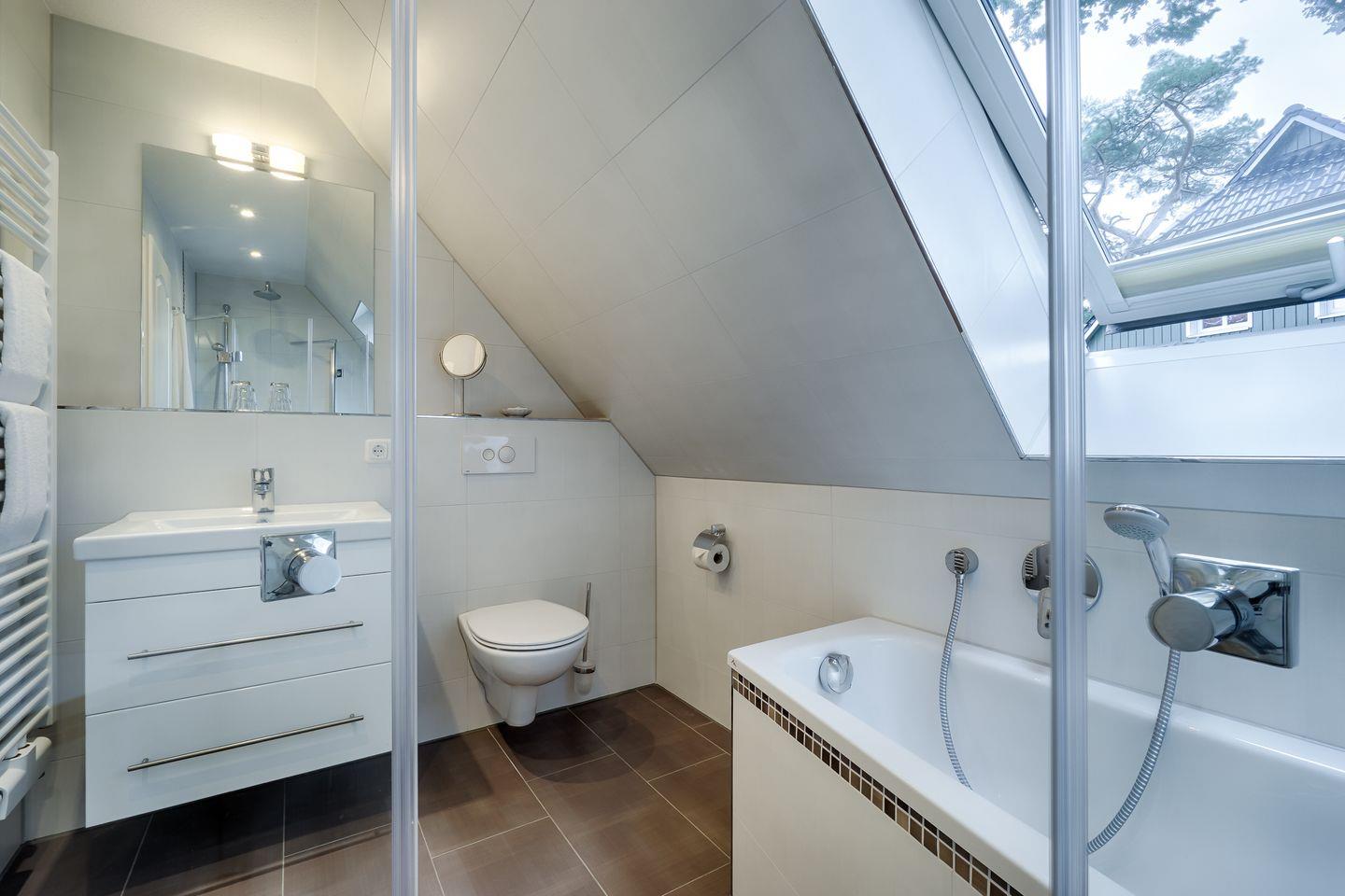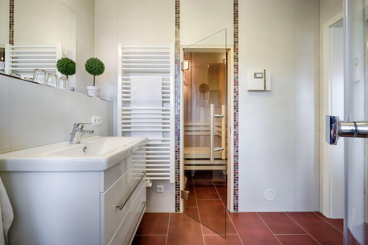 Badezimmer mit ebenerdiger Dusche und anliegender Sauna