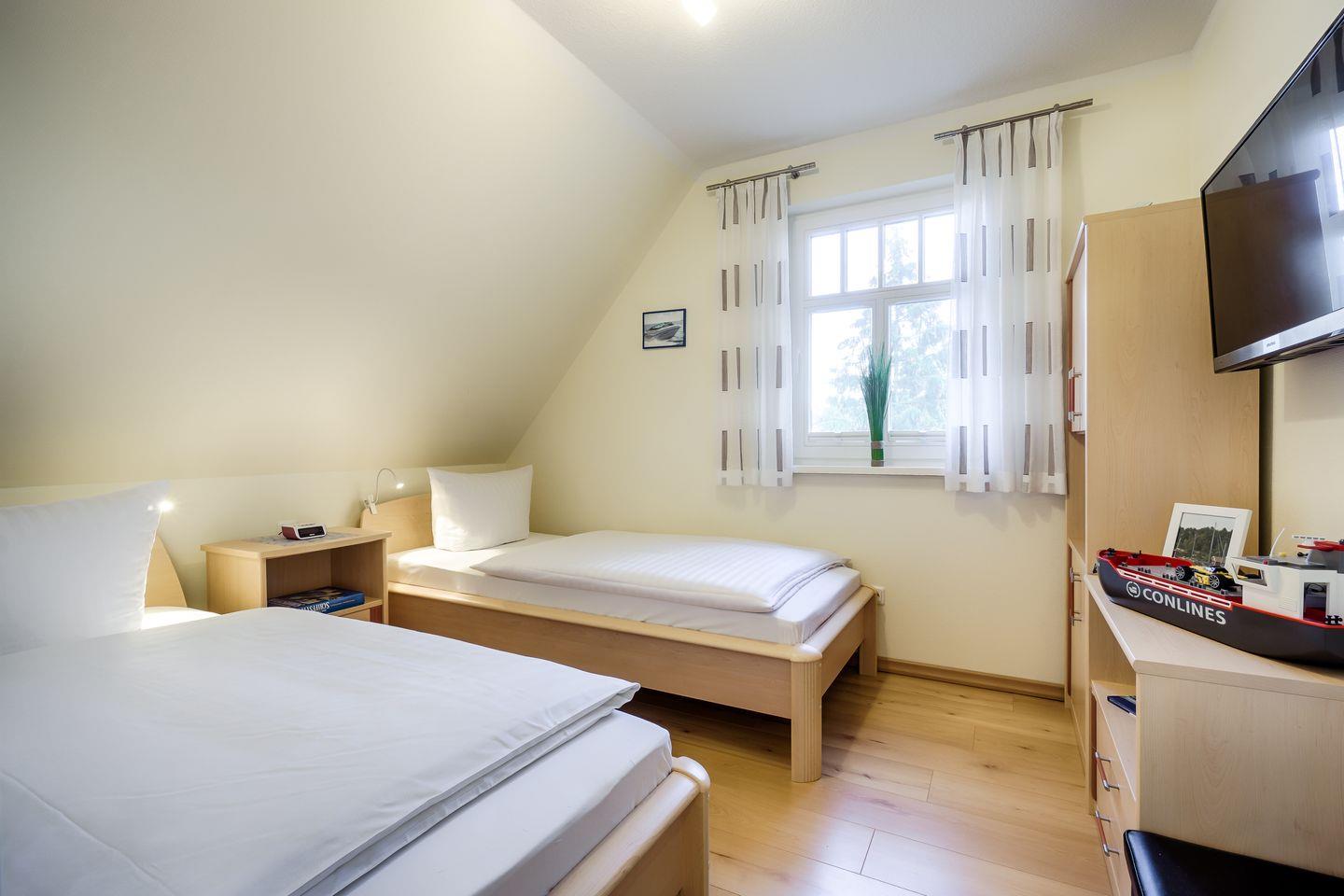 2 Schlafzimmer mit 2 Einzelbetten (0,90x2,00m), mit verstellbaren Lattenrosten, TV