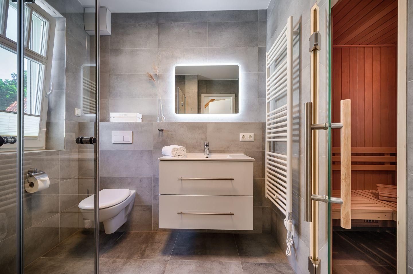 Badezimmer mit ebenerdiger Dusche und anliegender Sauna