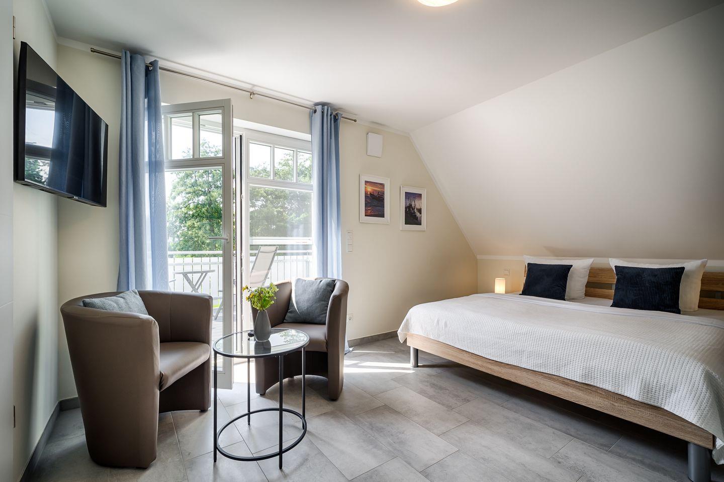 1 Schlafzimmer mit Doppelbett (1,80x2,00 m), mit verstellbaren Lattenrosten, Zugang zur Dachterrasse, TV, eigenes Badezimmer mit Dusche
