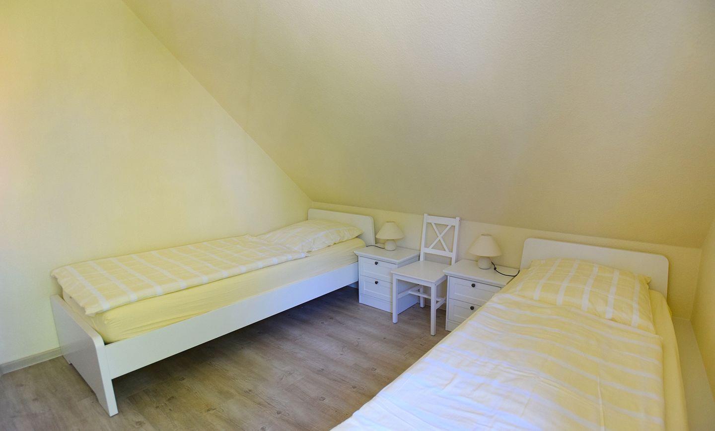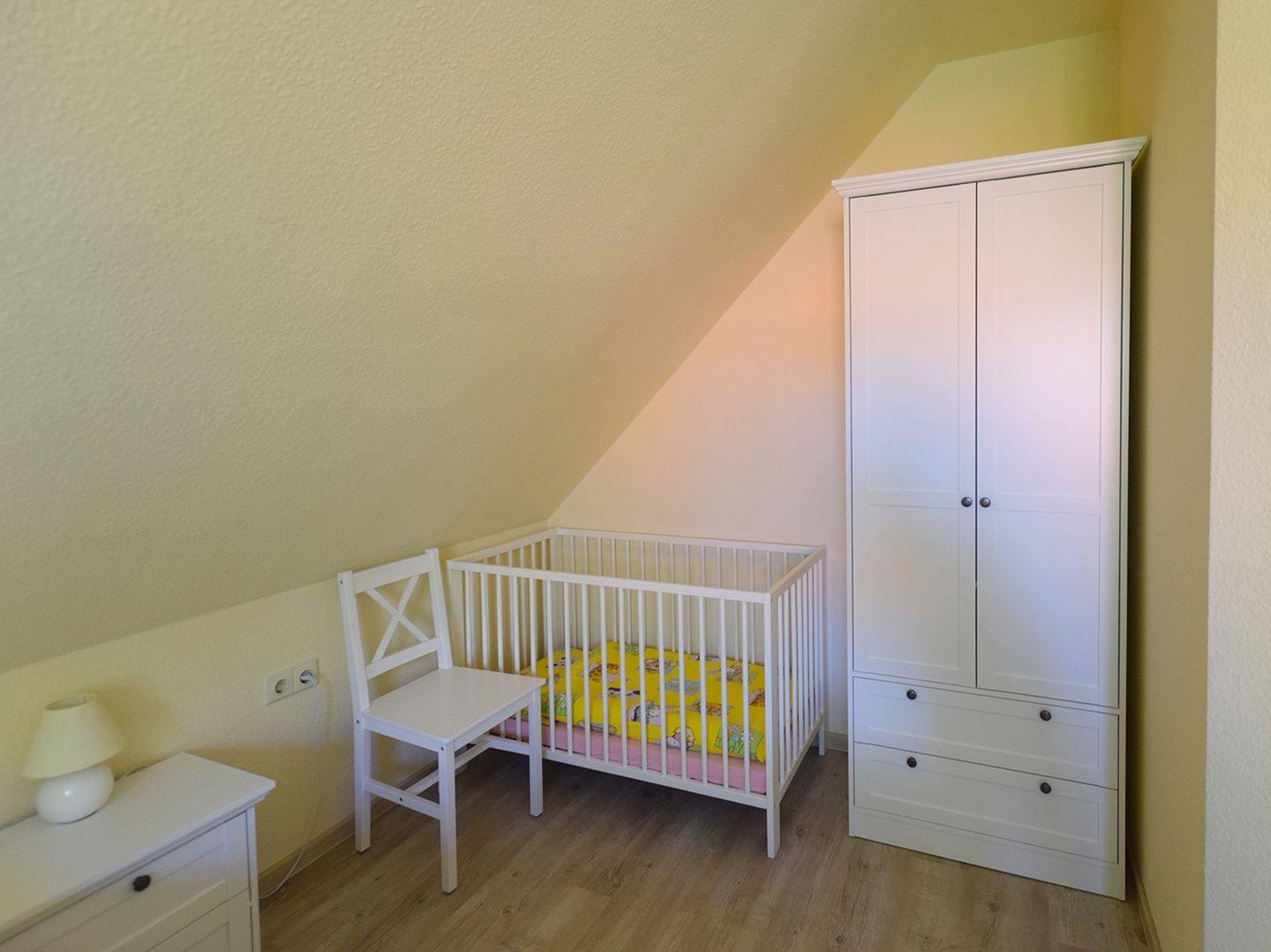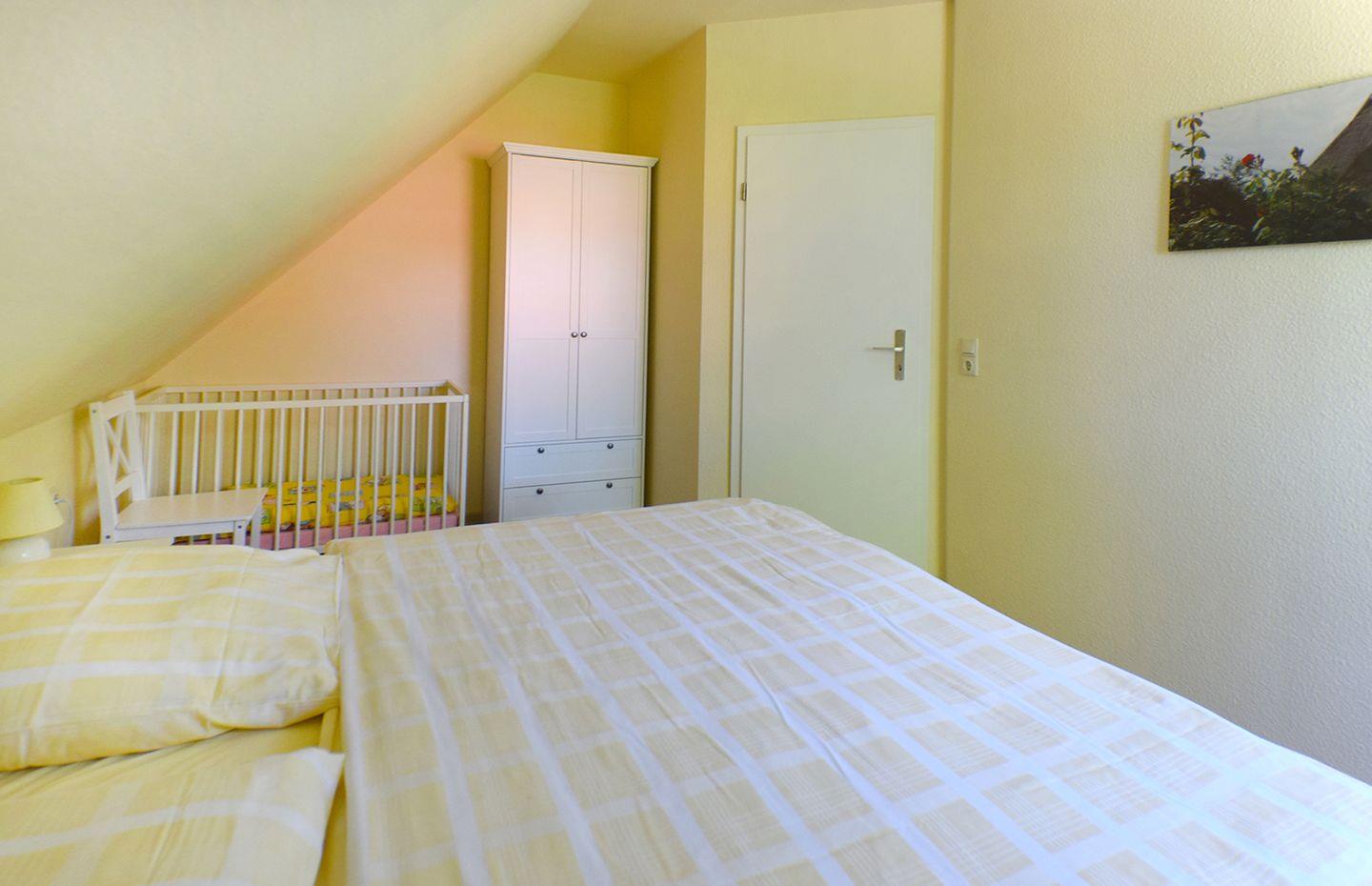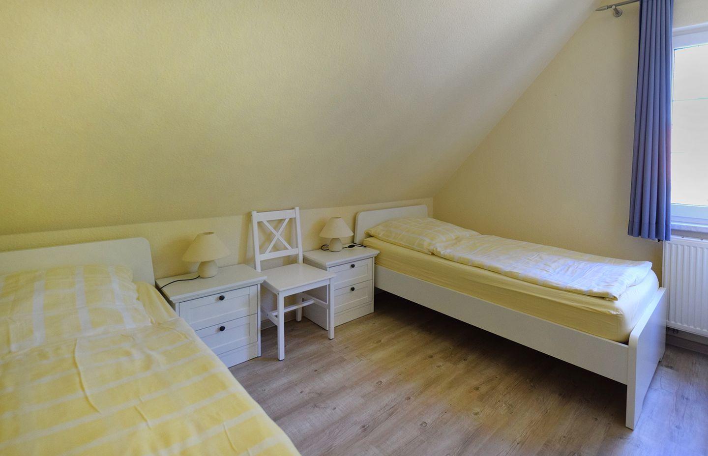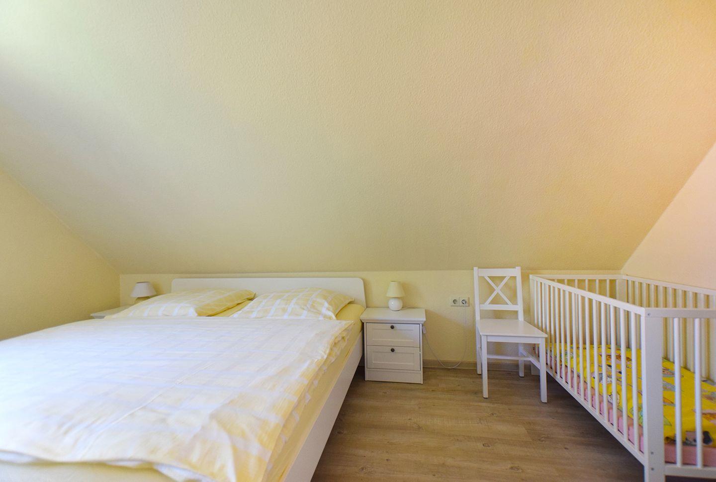 Reihenhaus bis 5 Personen | Haustiere möglich |  ca. 60 qm Wohnfläche | EG Wohnzimmer, Küche, Bad, Treppenhaus | DG (Treppe mit Kindersicherung) 2 Schlafzimmer | Terrasse | 1 Parkplatz | Wohnzimmer Schlafsofa, Radio mit CD/DVD-Player, TV SAT/Kabel | Küche mit Esstisch, Backofen, Herd/Cerankochfeld, Geschirrspüler, Kühlschrank mit Gefrierfach, Mikrowelle, Kaffeemaschine, Toaster, Wasserkocher | Bad Dusche, WC | 2 Schlafzimmer 1 Doppelbett (180 x 200 cm), 2 Einzelbetten (90 x 200 cm) | Inkl. Babygitterbett, Kinderhochstuhl | Gemeinschaftliche Nutzung von Fahrradschuppen, Grillecke, Sauna, Spielplatz, Waschmaschine, WLAN | Bettwäsche und 2 Handtücher pro Gast sind ab 7 Übernachtungen inklusive