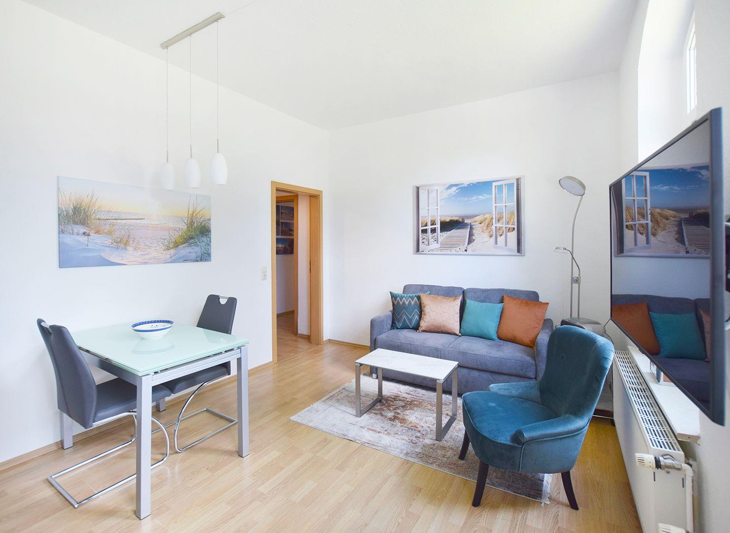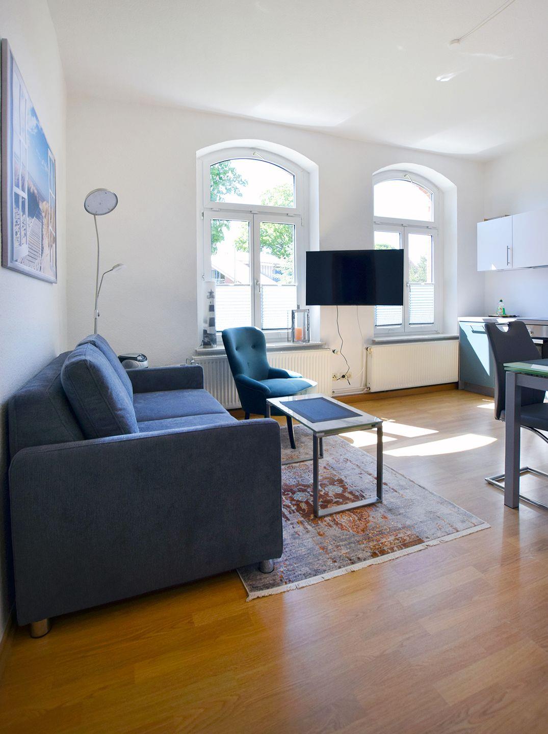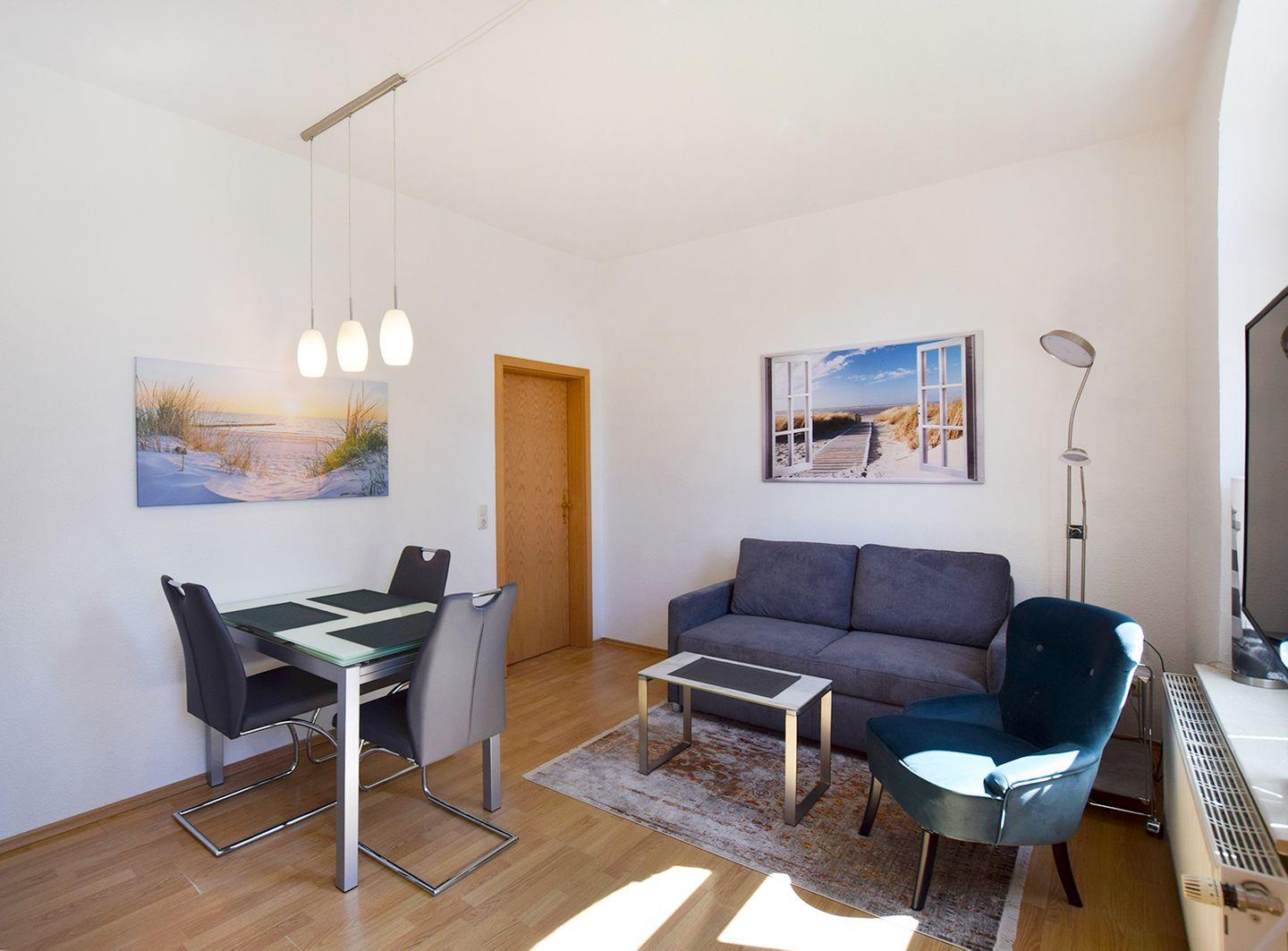 Diese charmante Ferienwohnung für bis zu 2 Personen bietet auf ca. 45 m² eine gemütliche und gut ausgestattete Unterkunft, die auch Haustiere willkommen heißt. Im Erdgeschoss befindet sich ein helles Wohn-/Esszimmer mit einem Esstisch, Schlafsofa, TV (SAT/Kabel) und einem Radio mit CD-Player. Die angrenzende Küchenzeile ist mit einem Herd, Backofen, Geschirrspüler, Kaffeemaschine, Kühlschrank mit Gefrierfach, Toaster und Wasserkocher ausgestattet – alles, was für eine angenehme Selbstversorgung nötig ist.