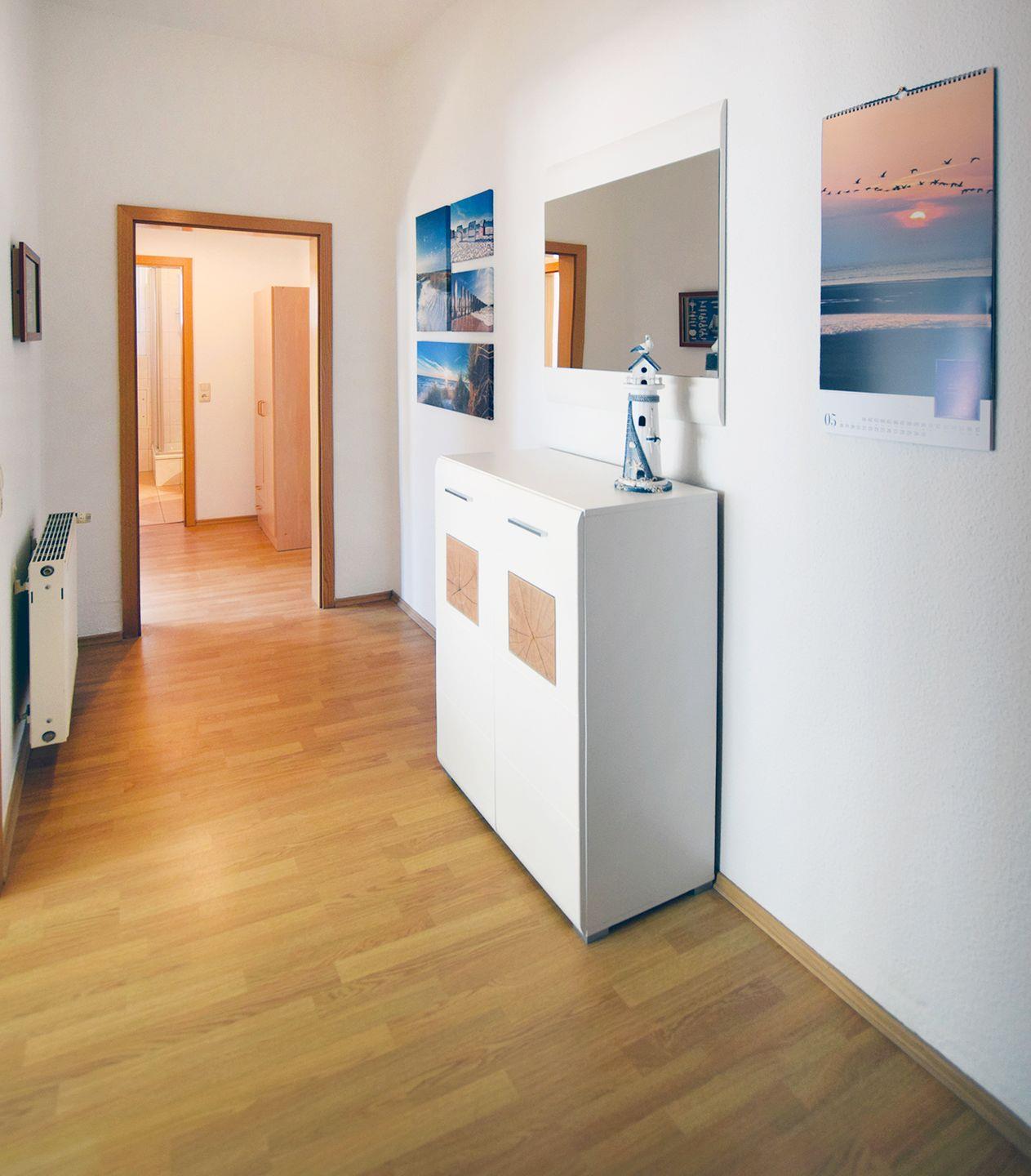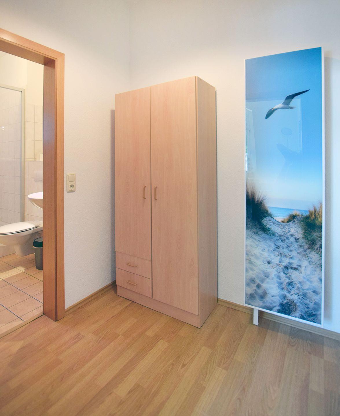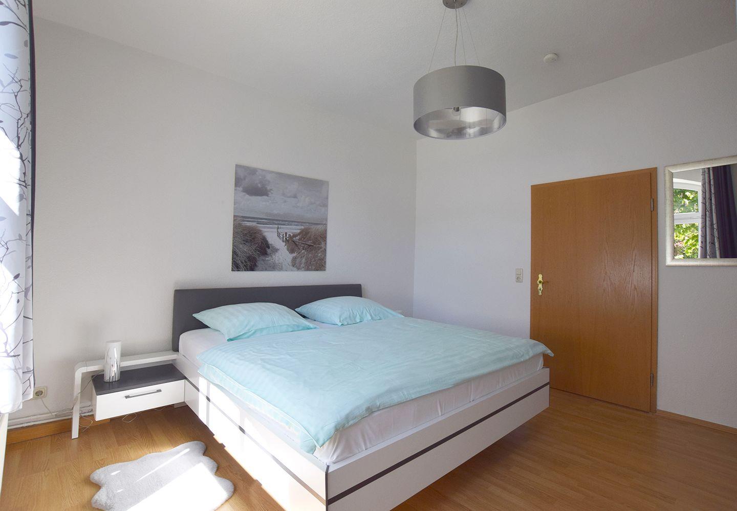 Das Schlafzimmer ist mit einem komfortablen Doppelbett (180 x 200 cm) eingerichtet. Das Badezimmer verfügt über eine Dusche und ein WC. Zur Ferienwohnung gehört